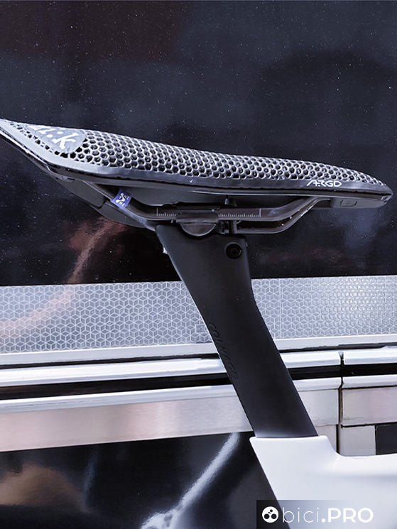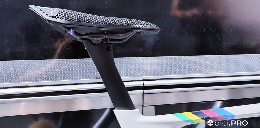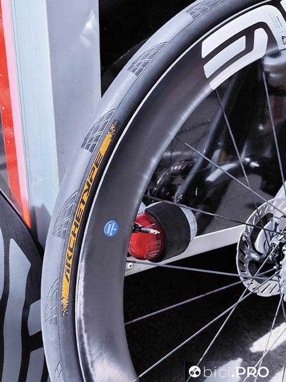 Pedivelle da 165 millimetri e ruote Enve 4.5 con profilo differenziato (50 millimetri all’anteriore e 56 al posteriore) con i mozzi color argento, nuovi e visti in anteprima al Giro. La posizione della sella Fizik Argo (creata con mappatura specifica e su misura) è tutta in avanti e parecchio scaricata verso il basso