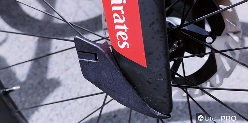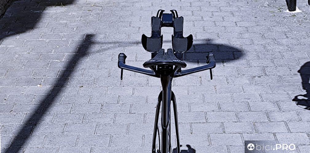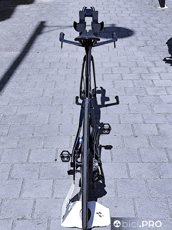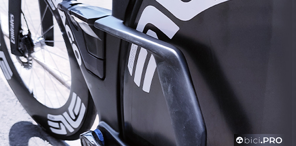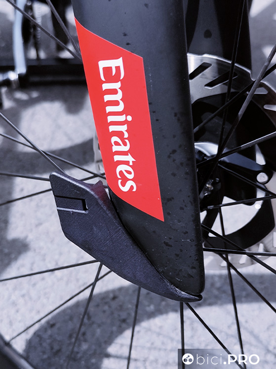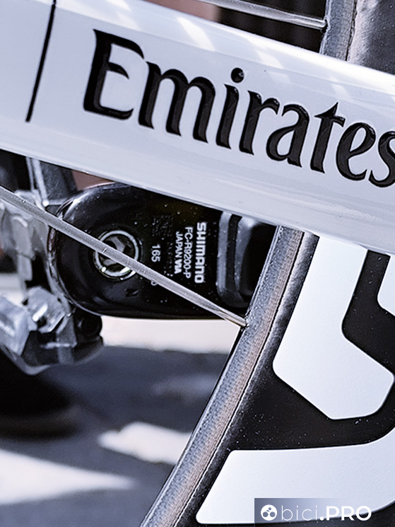 La prima cosa che si nota è che stavolta la bici è nera. Tadej non è l’iridato a crono, quello è terreno di Remco Evenepoel, quindi rientra nei ranghi. Il peso della bici non è stato dichiarato, ma alzandola e paragonandola con le due precedenti possiamo garantirvi che non vi si discosta troppo. Proprio il peso della bici da crono della UAE Team Emirates era stato messo sotto accusa qualche tempo fa, ma a quanto pare ci hanno lavorato e anche bene.