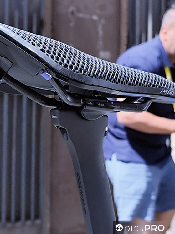 La Colnago Y1Rs è decisamente aggressiva. Sulla sua estetica si è detto tutto e il contrario di tutto, ma non si possono mettere in discussione le sue performance. Il setup di questa bici è quasi del tutto identico alla V5Rs. Quel che cambia, in virtù di geometrie un po’ differenti, è la posizione della sella. In questo caso è sì arretrata, ma come si dice in gergo, non va “a battuta”. E’ un filo più centrale. Nel senso che è posizionata almeno 4-5 millimetri più indietro rispetto al movimento centrale.