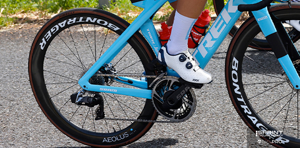 La trasmissione ed i freni sono Sram Red. Davanti uso sempre la combinazione 52-39 con il misuratore di potenza. La scelta dei pignoni invece dipende dai percorsi. Di solito chiedo la scala 10-28 oppure 10-33. Quest’ultima soluzione è quella che uso nella bici da allenamento che tengo a casa. Le ruote sono Bontrager e le più utilizzate sono quelle con il profilo da 51, ma onestamente le 62 sono quelle che preferisco. Bello vederle montate, sono un vestito perfetto per la Madone. I tubeless da 28 sono quelli più utilizzati, oppure i copertoncini sulla bici da allenamento.