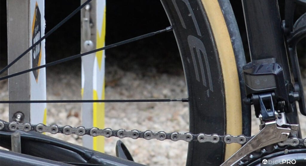 La bici di Van Aert è montata con componenti Shimano. Guarnitura 39-53 e pignoni dall’11 al 30. Nella guarnitura c’è integrato il misuratore di potenza. Quanto alla scelta delle ruote, Van Aert correrà con ruote in carbonio Shimano e tubolari Vittoria da 28: anche se il carro ha spazio per montare tubolari da 30, è evidente che in caso di tanto fango, sarebbe forse necessario ricorrere alla Caledonia, che ha effettivamente più spazio, essendo il carro più lungo.