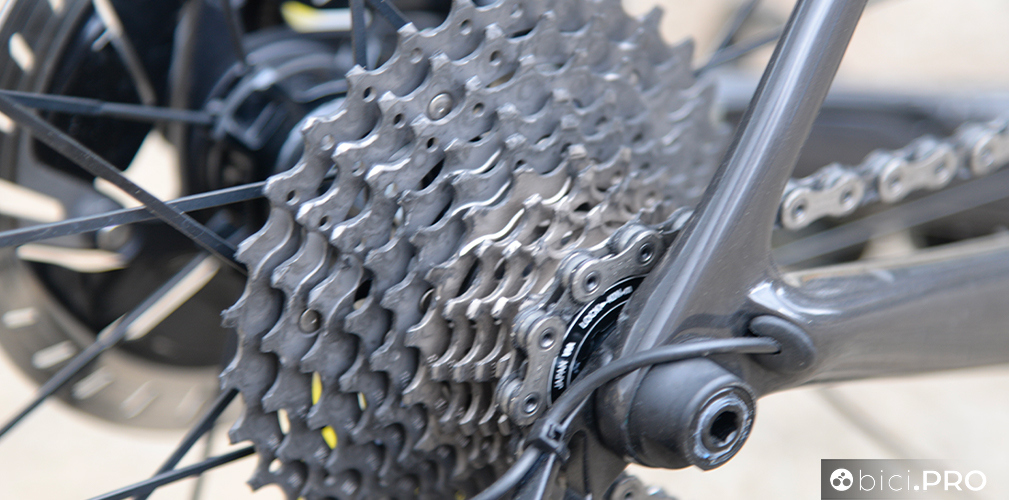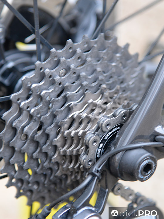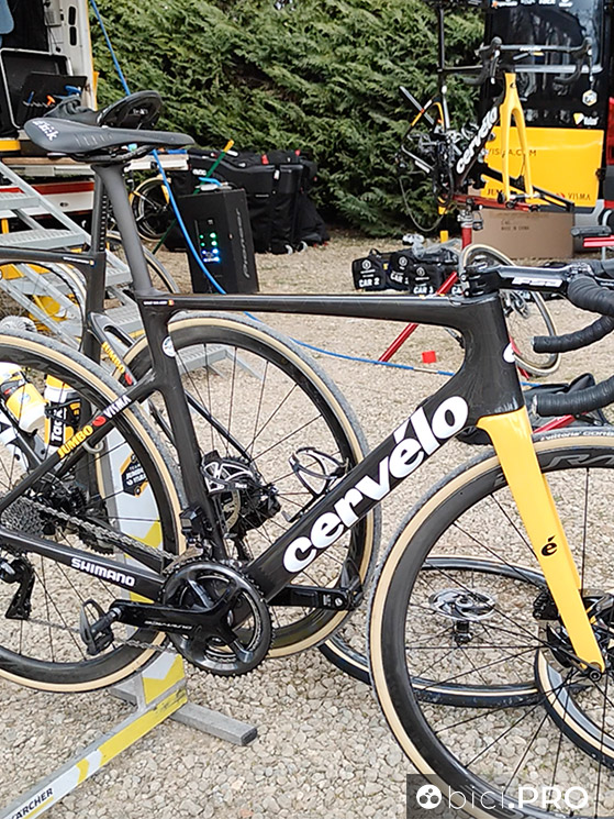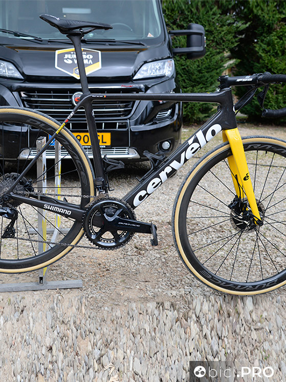 La Cervélo R5 color Jumbo Visma è una vecchia conoscenza, anche se viene aggiornata anno dopo anno. Rispetto alla precedente, questa è più rigida nei punti chiave del telaio pur restando leggerissima. L’attento equilibrio tra rigidità e peso si traduce in una bici che risponde rapidamente agli input, ma è stabile e prevedibile in velocità. Rigidità e geometria lavorano inoltre per ottenere efficienza di pedalata e maneggevolezza. A detta dei corridori, i freni a disco assicurano un’azione potente (160 anteriore, 140 posteriore), mentre la possibilità di montare gomme da 30 millimetri rende la guida molto agevole (anche se visto il poco spazio rimasto fra piantone e gomma con le 28 fa pensare che in caso di fango la 30 sia forse poco pratica). Questa volta l’attacco manubrio ha la giusta inclinazione, segno che anche l’altezza del tubo di sterzo è decisamente stradale.