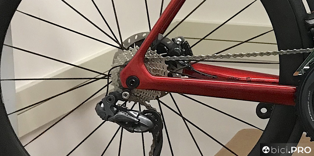 Su strada non c’è bisogno delle maggiorazioni “Boost” (148 millimetri) che sono usate nella Mtb. Quindi i perni posteriori sono tutti larghi 142 millimetri al posteriore. I vecchi assi erano più stretti di 7-9 millimetri (mediamente), infatti spesso il morsetto tendeva a stringere il carro. Una base più larga vuol dire un peso distribuito su un’area maggiore e quindi meno pressione sul singolo punto e più scorrevolezza.