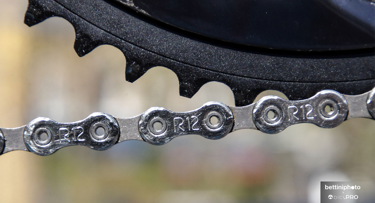 Oggi, con il fatto che spingono rapporti lunghi, specie i capitani, tendono a tenere sempre il 53, o comunque la corona grande, anche in salita e sfruttano dietro tutta la scala, pertanto la catena lavora storta. E con i chilometri si “apre” di più rispetto ad un ciclista normale. Di solito le catene sono garantite per circa 4.000 chilometri, ma come detto dopo una settimana di gara le leviamo per precauzione. I gregari, che magari in salita non devono tirare le trattano meglio, mettono il 39 e la catena lavora più dritta.