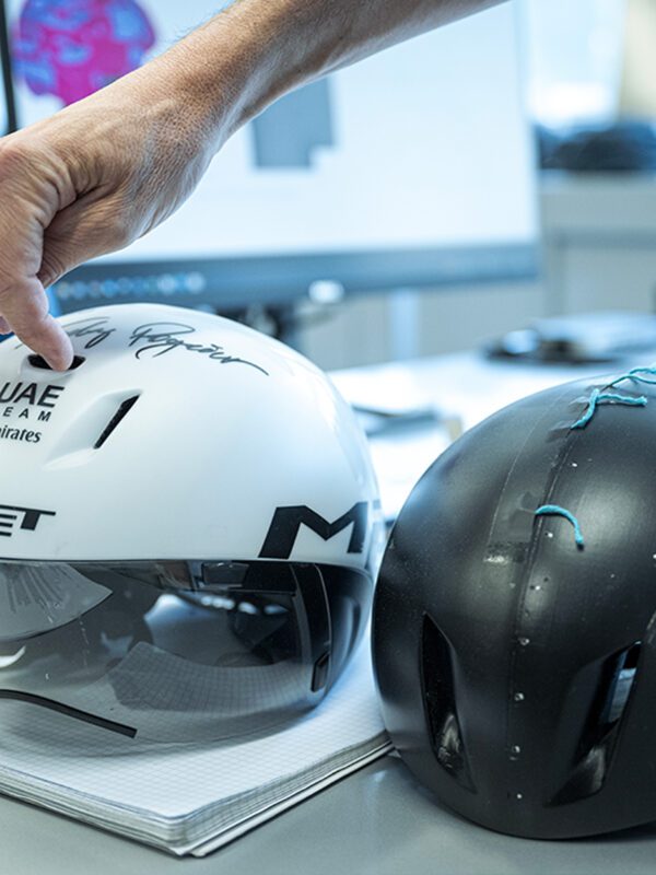 Per la categoria dei caschi da cronometro, oltre allo sviluppo dello stile, della struttura e delle analisi dei dati relativi alla sicurezza, ci sono le questioni legate all’aerodinamica. Qui entrano in gioco anche dei componenti aggiuntivi, come ad esempio quelli relativi al fissaggio della lente. Rispetto ad un casco da strada, l’aerodinamica è soggetta ad un doppio sviluppo.