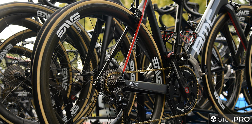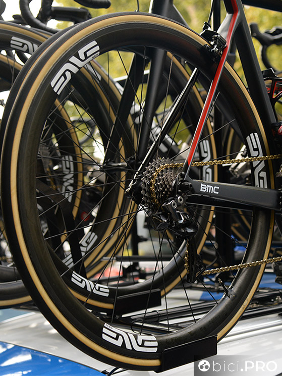 Un elemento che ci è saltato subito all’occhio è che non ci sono ruote particolari o fatte su misura, ma sono tutti modelli che si trovano in commercio. Questo è dovuto a più fattori, innanzitutto la qualità dei materiali moderni, i processi produttivi evoluti e la ricerca e sviluppo sempre più spinta. Inoltre bisogna ricordare che i telai e i componenti che usano i professionisti devono essere per regolamento materiali che si trovano in commercio. Quindi non vedremo più la ruota fatta solo per il singolo corridore come avveniva fino ad alcuni anni fa.
