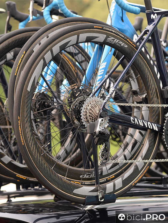 Profilo leggermente più basso per le Zipp 303 NSW in dotazione al Team Movistar. Queste ruote vantano un’altezza di 45 millimetri con il profilo innovativo NSW (Net Speed Weaponry) dotato della tecnologia ABLC Sawtooth. In pratica si tratta del rivestimento fatto come una pallina da golf. Questo permette di migliorare la resistenza e la stabilità in caso di vento laterale, in quanto si creano dei mini vortici sulla superficie del cerchio. La larghezza esterna del cerchio è di 28,5 millimetri per un peso di 1.425 grammi.