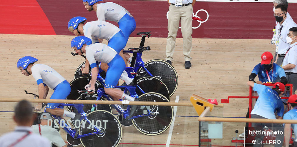 Per quanto riguarda le pedivelle invece: Milan e Ganna, i più alti, avevano quelle da 175 millimetri, mentre Consonni e Lamon quelle da 172,5. Chiaramente erano sempre di Miche, così come i pignoni.