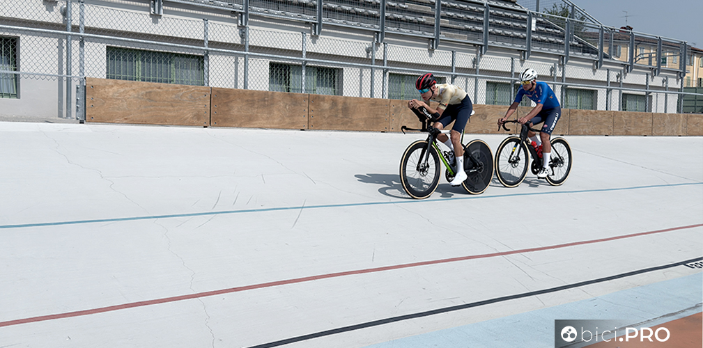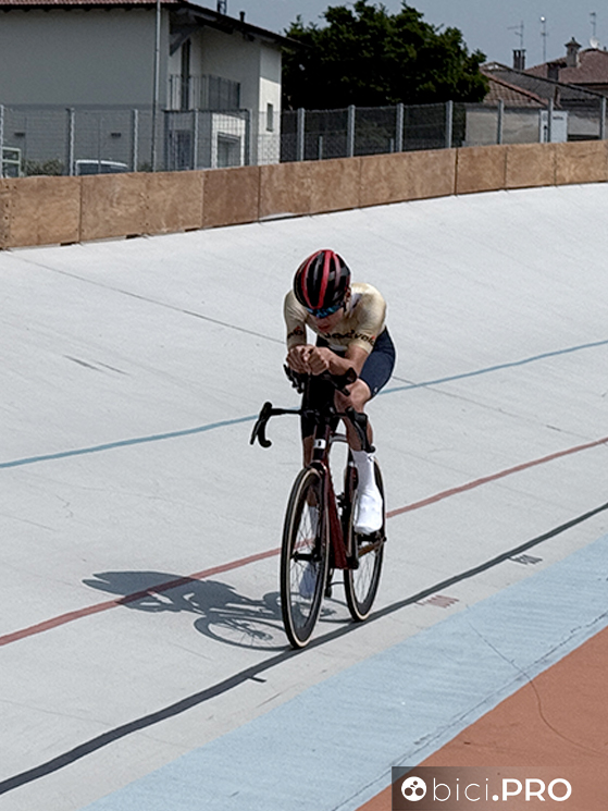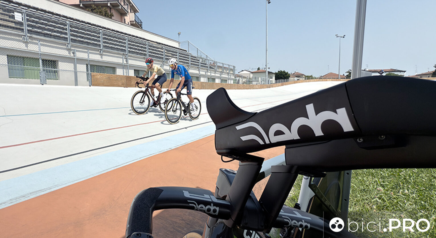 1,01 chilometri percorsi per ogni singola fase della prova, quindi con ogni set di protesi e la distanza è stata percorsa all’interno del terzo segmento del velodromo, quello compreso tra la riga nera e quella rossa. Lorenzo Ghelfi ha utilizzato una bici standard (Drali Ametista), prima con le Deda Parabolica PRO in alluminio e in seconda battuta con le Fast PRO in carbonio, estensioni che appartengono alla medesima famiglia. Il wattaggio di riferimento di Ghelfi è stato di 320 watt per le due prove. Agostinacchio ha utilizzato la bici da crono Colnago (senza freni a disco, ma con ruota lenticolare posteriore), prima con le protesi Deda Jet, per passare alle Jet Hydro personalizzabili nella seconda fase. 350 i suoi watt di riferimento. Per entrambi i giovani atleti si è cercato di mantenere la medesima altezza delle estensioni, in modo da non cambiare la penetrazione aerodinamica della sezione frontale (testa, spalle, busto e schiena).