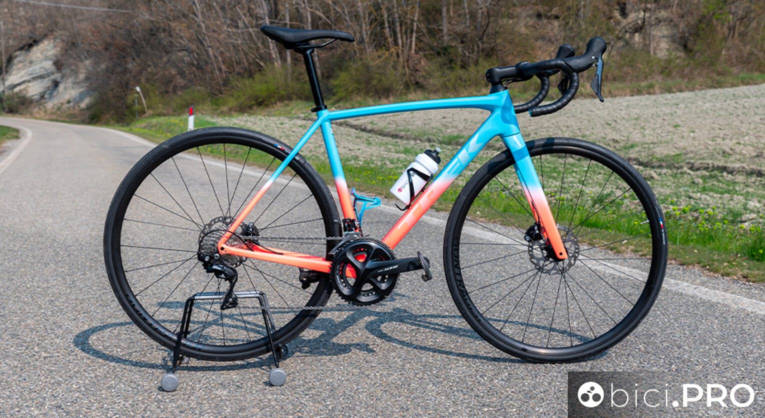 Si tratta di una taglia 54, con un valore alla bilancia rilevato di 9 chilogrammi netti. Un montaggio sostanzioso che nulla fa per abbassare il peso. Attacco e piega Bontrager in alluminio, così come il reggisella. Sella Bontrager, non in carbonio e trasmissione Shimano 105 2×11. Ruote Bontrager in alluminio con un profilo basso (compatibili anche con i tubeless) e gomme Bontrager da 25. I dischi dei freni sono da 160 millimetri di diametro. Il prezzo di listino è di 2.599 euro.