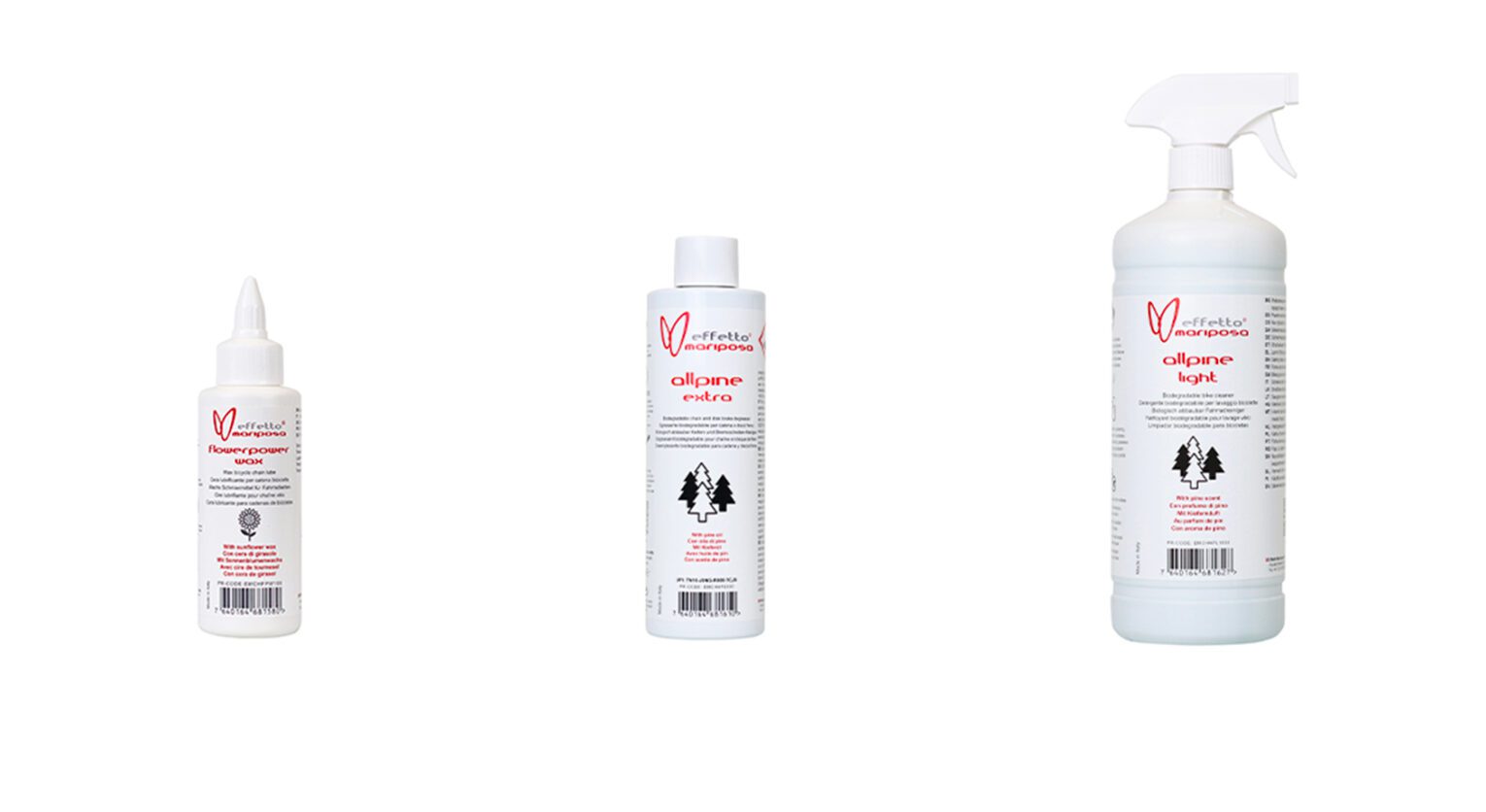 Flowerpower Wax utilizza ingredienti naturali per avere prestazioni ed affidabilità, tutto questo evitando composti fluorurati (PFAS), grafene e solfuri. Allpine Extra è un potente sgrassante con l’aggiunta di olio di pino, un solvente di origine naturale, prezioso per queste finalità. Infine Allpine Light, un detergente biodegradabile adatto a tutti i telai, che grazie alla sua formula è molto efficace contro lo sporco, non necessita risciacquo, e risulta ideale anche per le e-bike.