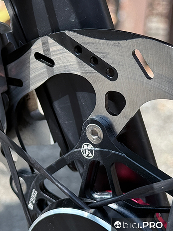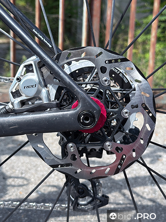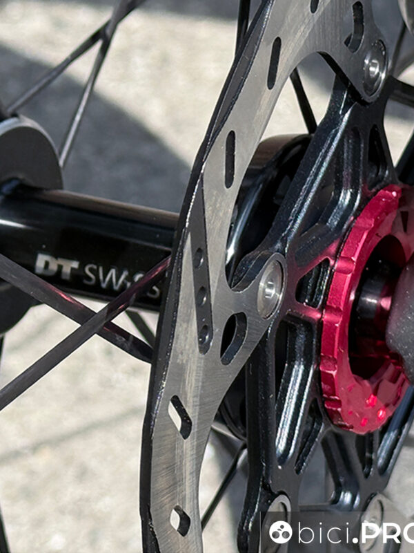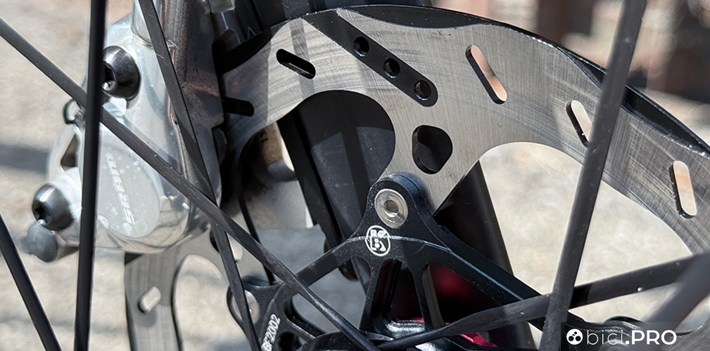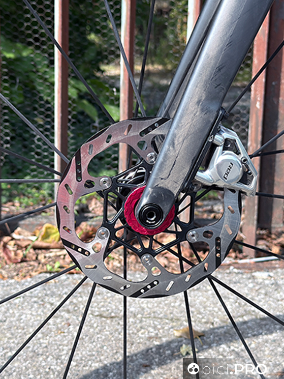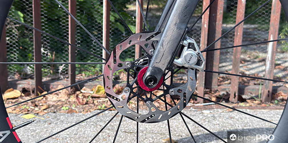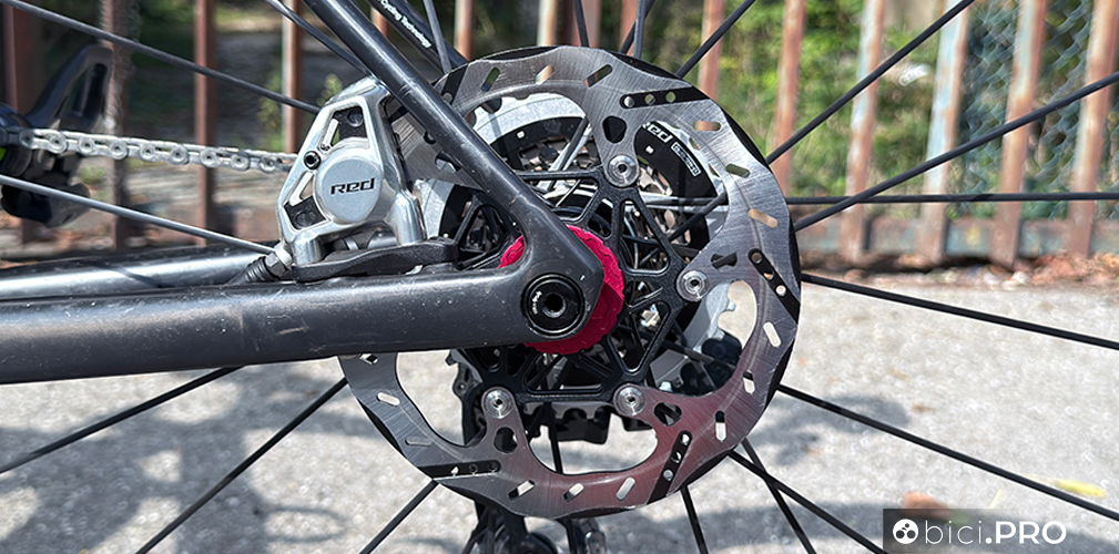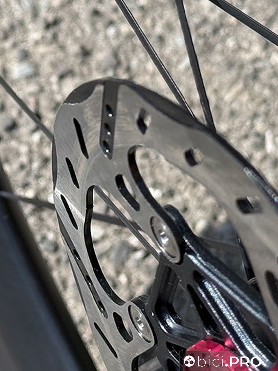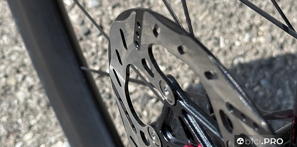 Non c’è carbonio, il ragno è in alluminio e la pista frenante è in acciaio temprato con la tecnologia ad induzione. Una delle particolarità è la presenza di creste a sezione rettilinea, sono forate ed aumentano la dissipazione termica. Il calore, uno dei grandi nemici degli impianti frenanti a tutti i livelli. BrakeForce può essere un componente gamechanger? Li abbiamo provati.