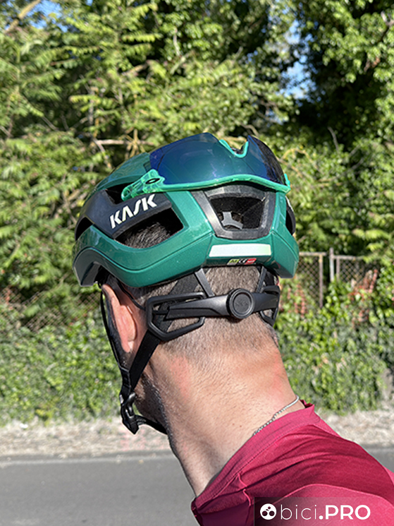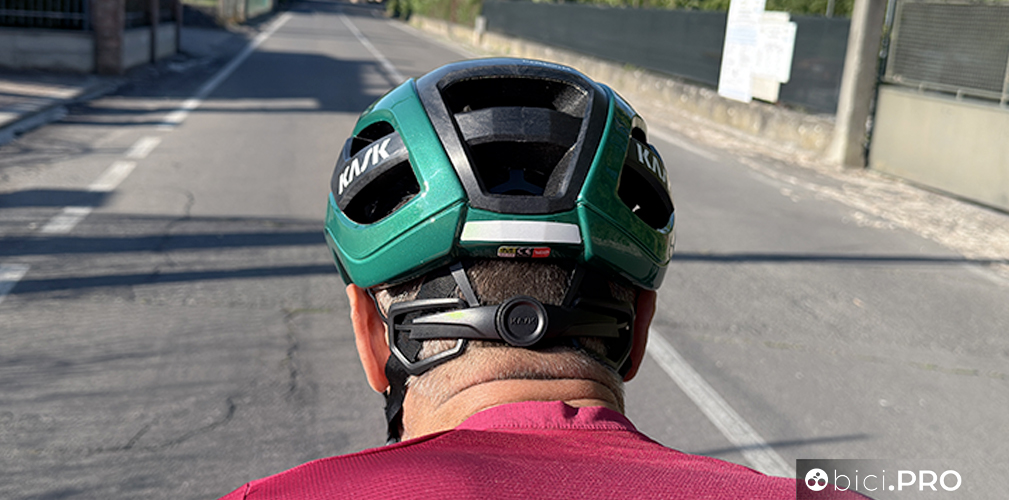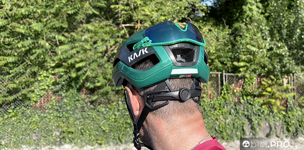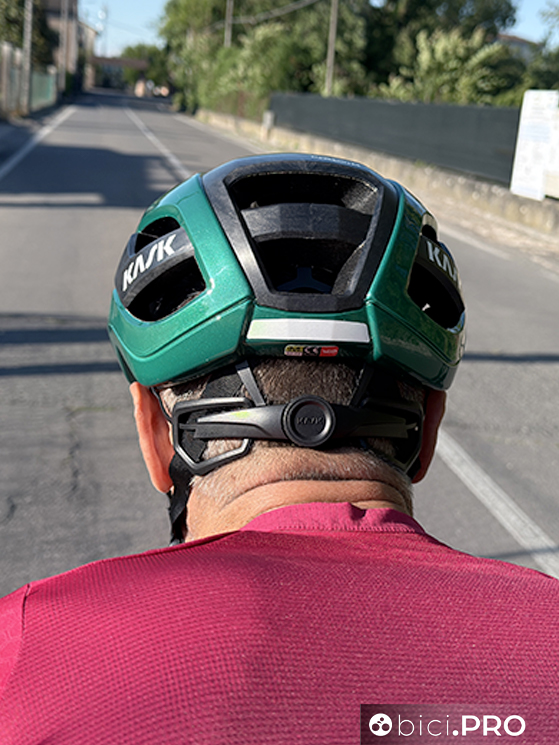 A nostro parere è più comodo, anche se il concetto di fitting Kask (superlativo sotto molti punti di vista) non è stato stravolto. Elemento è più fresco e ventilato, più leggero ed impercettibile anche quando la temperatura esterna sale in maniera importante. Non comprime nessuna delle zone più delicate della testa, soprattutto quella sfenoide e occipitale. Il design è gratificante, perché è rotondo, ma non è una palla, è compatto, ma completa l’immagine del ciclista (oggi non è un fattore secondario), con o senza occhiali. Inoltre, soprattutto nella sezione anteriore, sulla linea orizzontale non sporge e non crea fastidi.