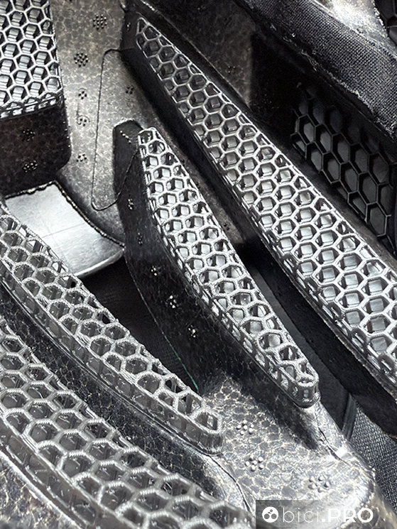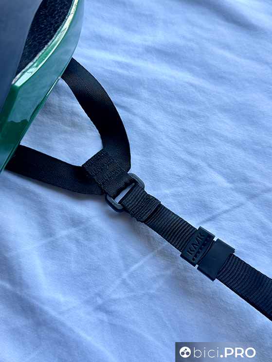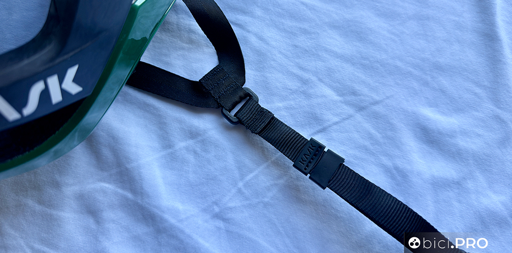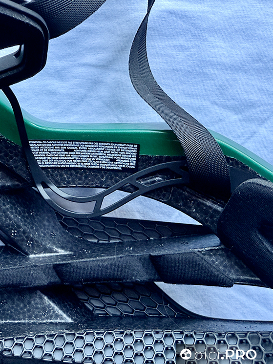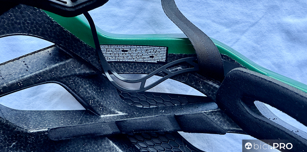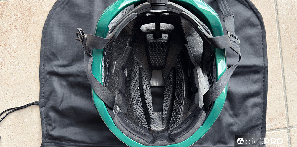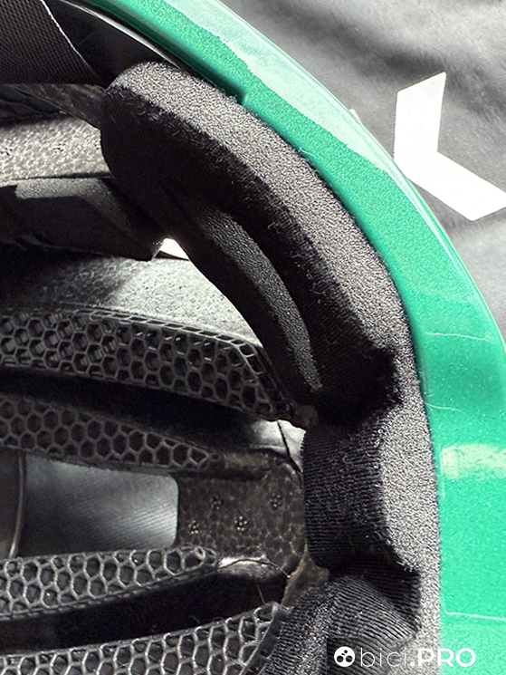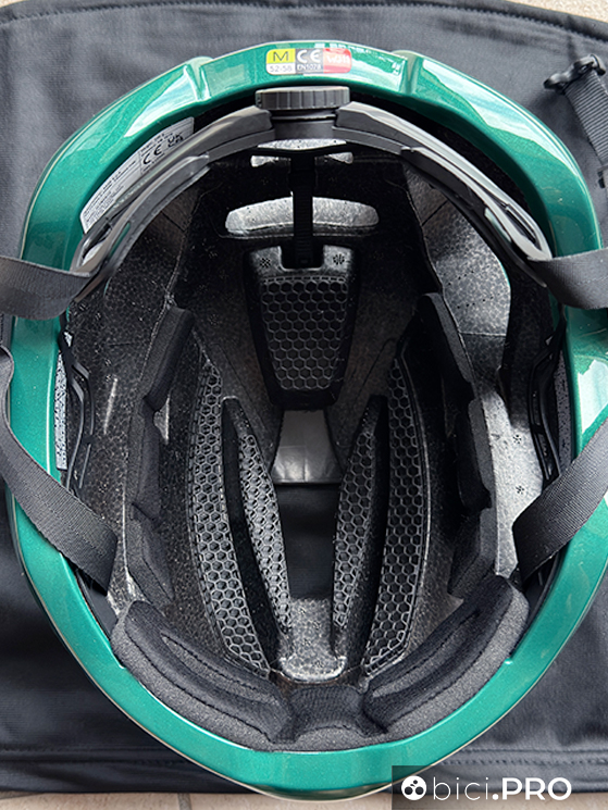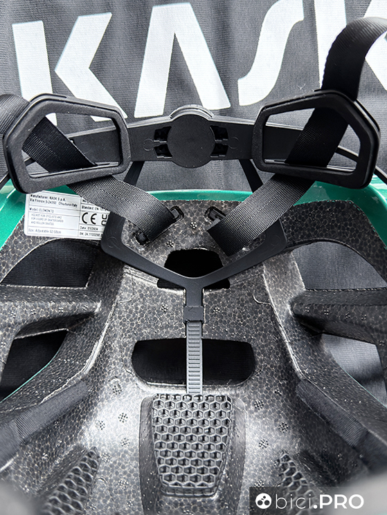 Poi ci sono le imbottiture, diverse dal solito. Quelle frontali, poste al di sotto delle due bocche, sono rifinite in lana Merino, mentre quelle superiori sono chiamate Multipod. Oltre ad assolvere alla funzione di imbottitura vera e propria, il materiale isotropo (flette e si comprime in modo uguale in tutte le direzioni) aumenta e implementa in concetto WG11 di Kask ed è importantissimo nella fase (eventuale) di distribuzione delle forze generate in caso di impatto. Il disegno a celle non trattiene il calore e lascia passare l’aria, azzera l’accumulo di umidità e vapore. Il sistema di chiusura, ben fatto, permette di regolare anche la taglia.