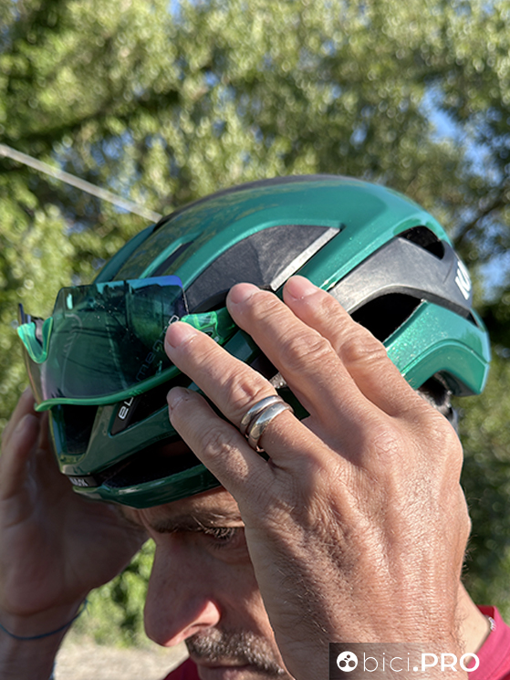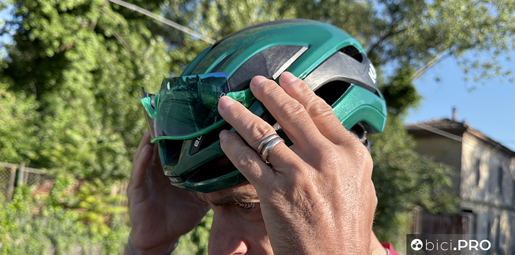 Non abbiamo riscontrato particolari difficoltà nel posizionare gli occhiali, davanti e nelle feritoie posteriori, anche se il Kask Elemento non prevede degli inserti grippanti. Le aste, una volta inserite beneficiano di canali profondi che, da un lato bloccano, dall’altro fanno sì che non interferiscano con la testa.
