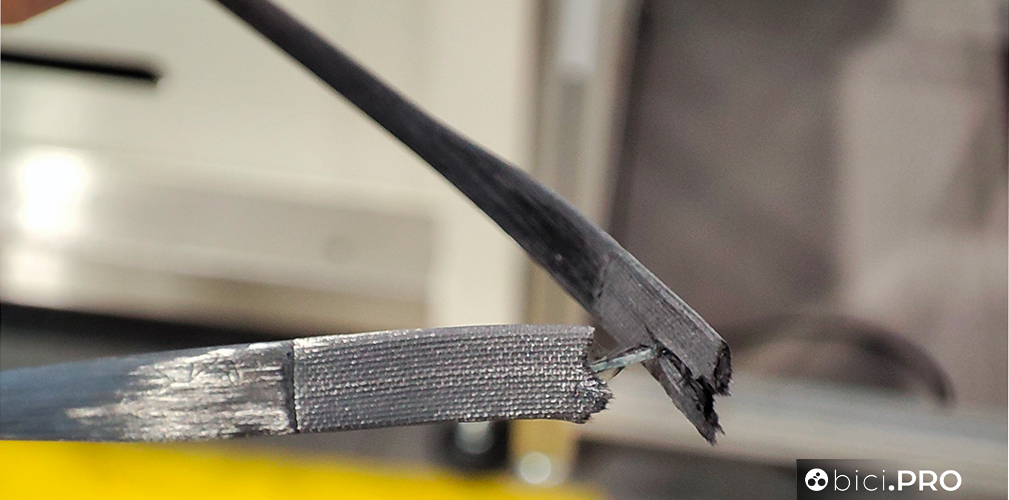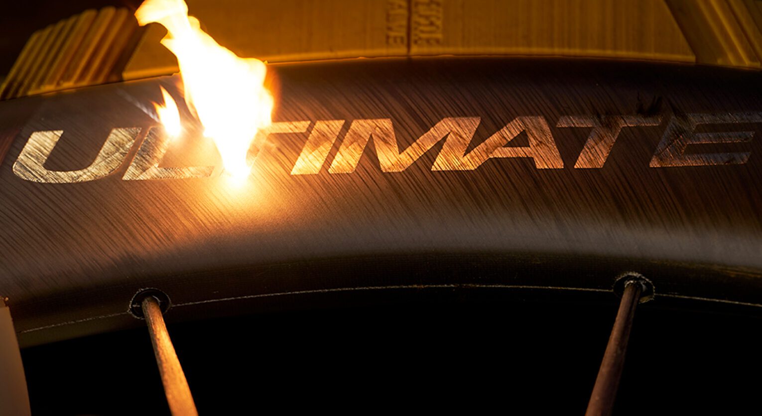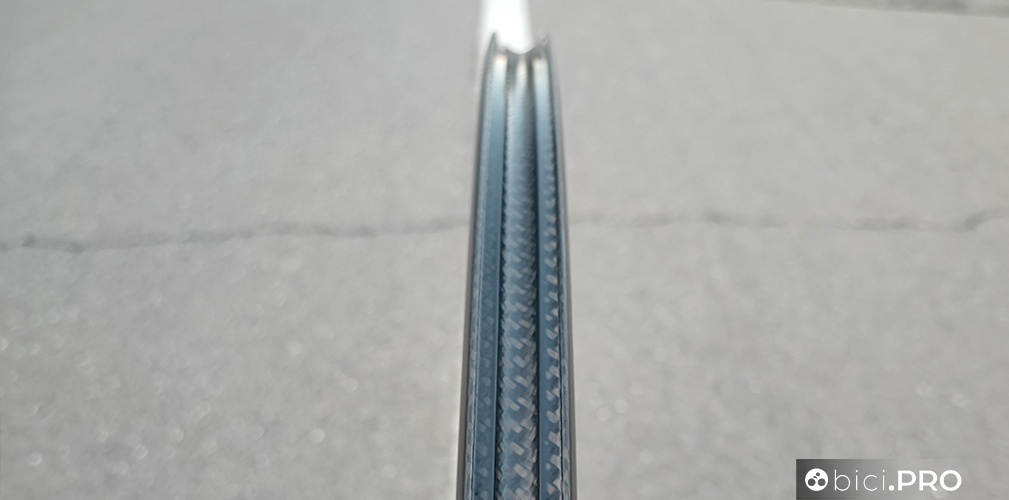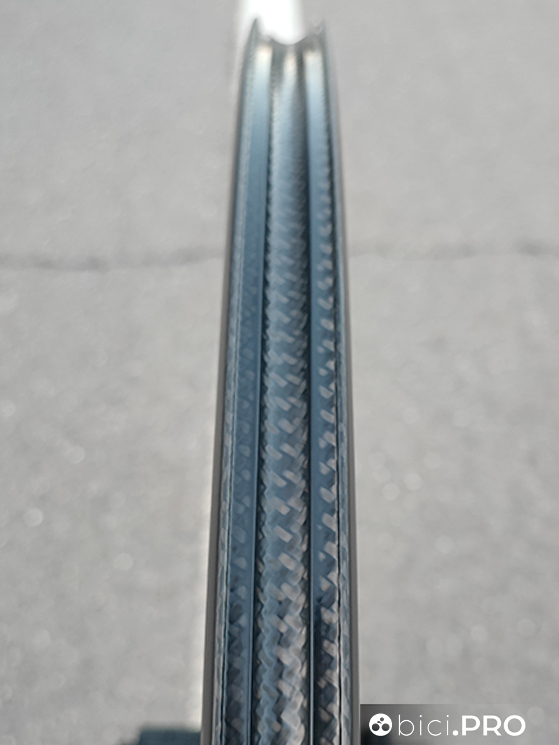 Il cerchio è da 45 millimetri di altezza e ha un canale interno da 19 (28 è la larghezza complessiva del cerchio con profilo Naca). Lo stesso canale non necessita del tubeless tape. Il carbonio è un blend di 5 tipologia fibre che si basano sulla matrice UD, che in base alle zone hanno degli orientamenti differenziati. La scritta Ultimate sul cerchio non è un adesivo, ma è ottenuta grazie ad un procedimento laser long-life.