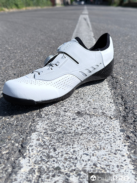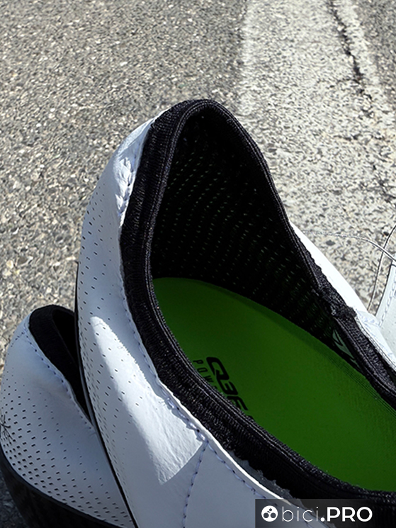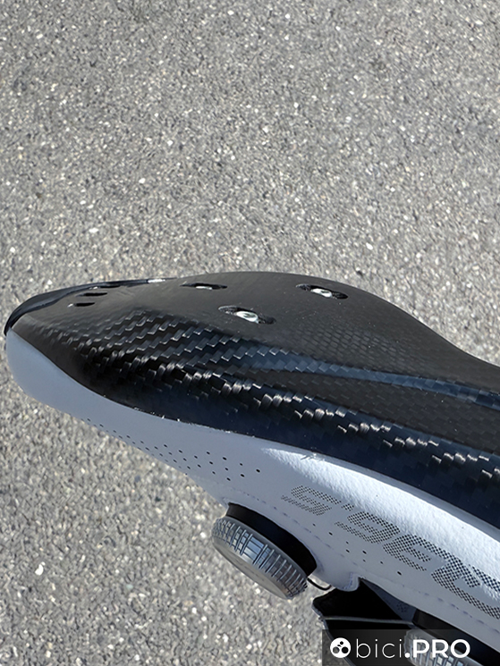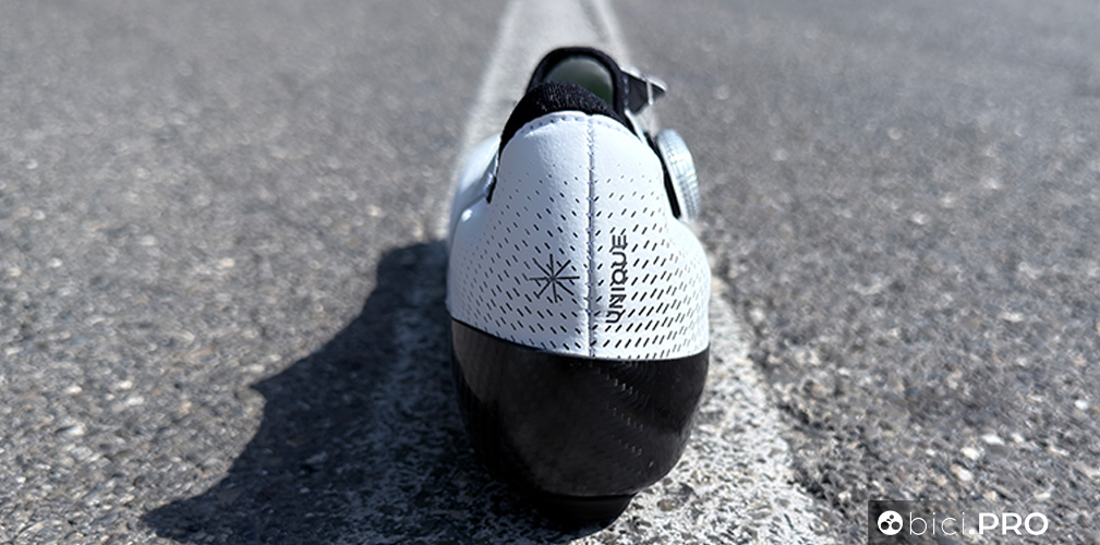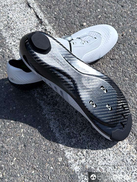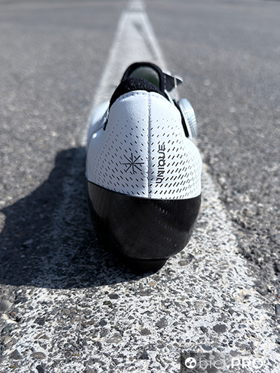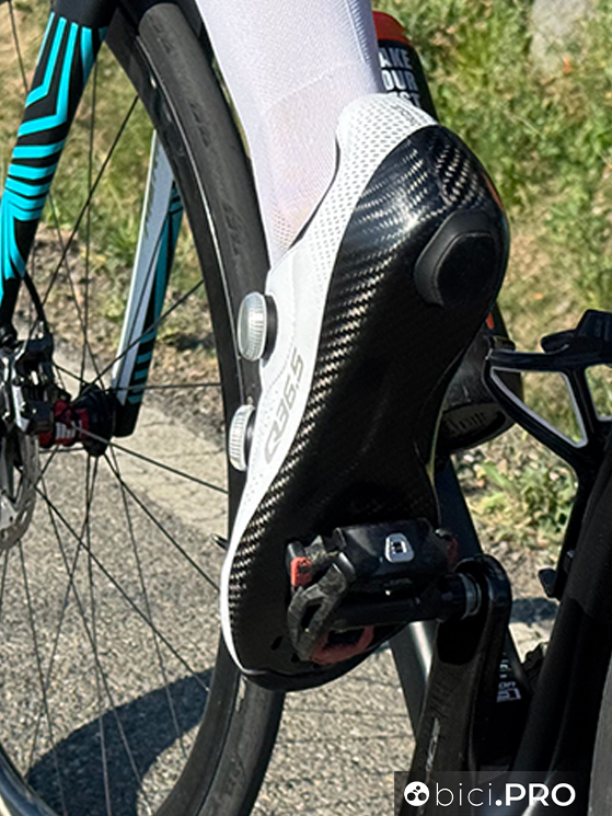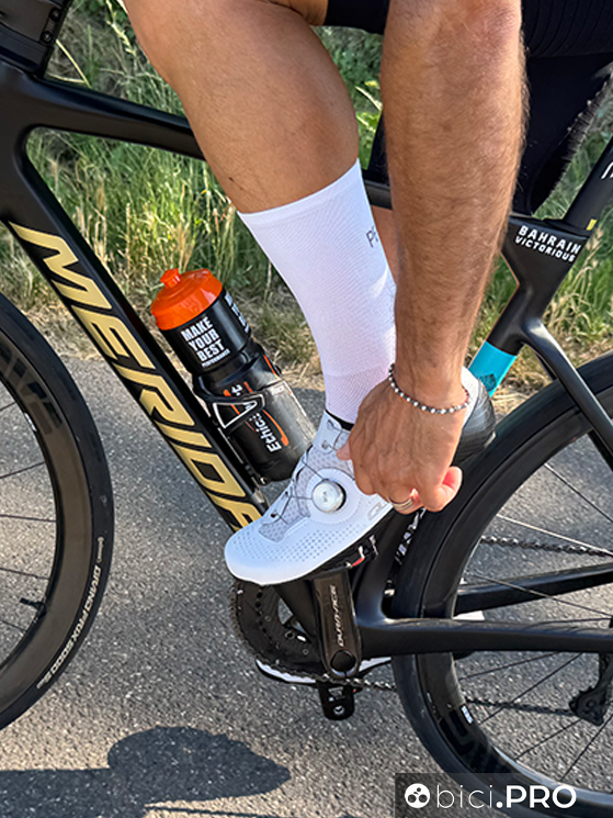 Chi proviene da una “calzatura classica” con la suola piatta, deve mettere in conto una fase di adattamento prolungata, per via della suola così alta dietro che, contiene il tallone come poche altre. L’imbottitura interna in questo punto aiuta (non poco), ma è necessario comprendere al meglio una suola che è diversa dagli standard. E’ un blocco unico, non ha flessioni. Chi arriva da una tipologia di scarpa simile (o per lo meno che adotta i medesimi concetti, di design e disegno della suola) è sicuramente avvantaggiato nel “capire” la calzatura e sfruttarne le potenzialità. Il plus è la Unique Pro nella sua totalità, sicuramente costosa, ma ben fatta e curata in ogni dettaglio. Infine lo stack ridotto della suola, un altro argomento che merita di essere snocciolato. 4,4 millimetri è un numero ridotto e traducendo, il piede di avvicina tantissimo all’asse di battuta del pedale.