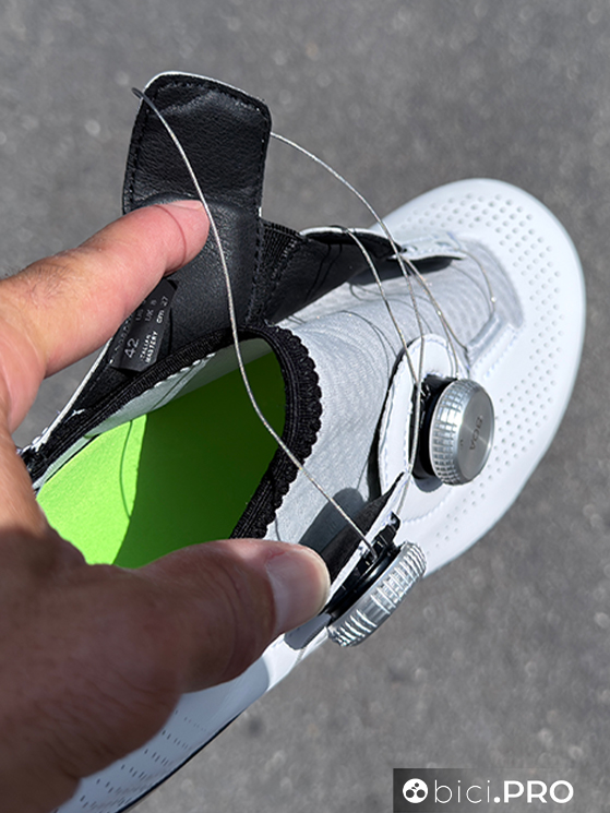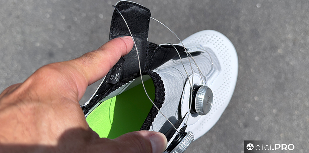 La struttura portante della tomaia è forata, ma al tempo stesso compatta e ricorda la vera pelle. La linguetta è diversa dal solito, perché è un tessuto in mesh che funge come una calza. Si adegua al piede, non si arriccia e segue perfettamente l’azione di chiusura dei rotori. Inoltre, grazie alla sua morbidezza, tende a dissipare la pressione generata (inevitabilmente) dai cavi. Quello superiore è diretto, quello inferiore adotta un incrocio e tutti i punti di snodo sono in tessuto.
