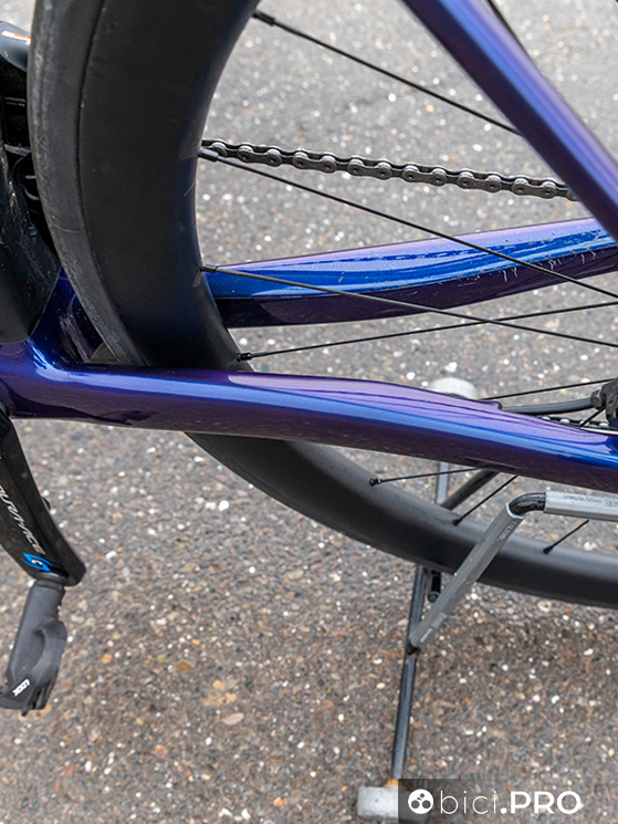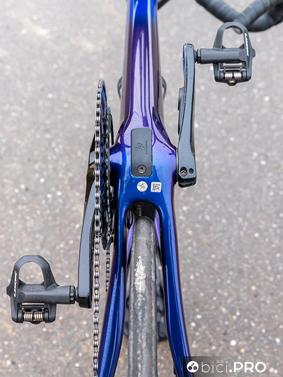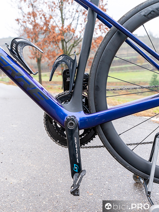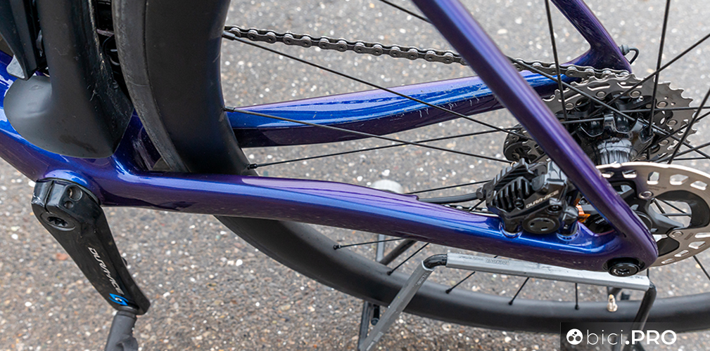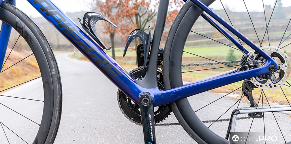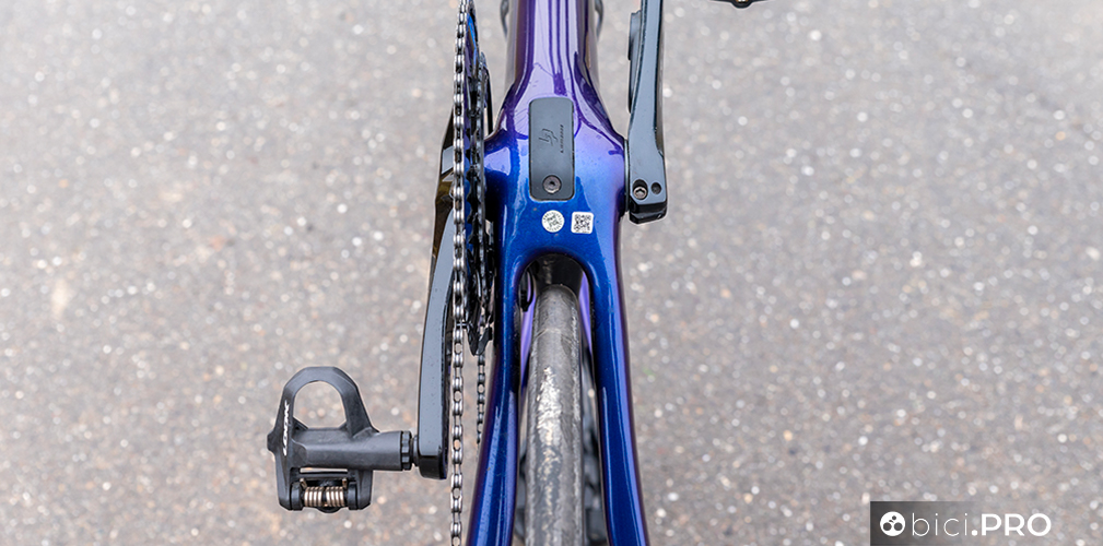 I due foderi obliqui, nel punto in cui si uniscono all’orizzontale, sfruttano una superficie maggiore e più squadrata. Sono diversi anche i terminali del carro posteriore, più abbondanti rispetto al passato e con delle ghiere filettate per l’alloggio del perno passante che arrivano dalla Aircode. Inoltre il braccetto di supporto del cambio è Direct Mount. La forma dei due foderi bassi adotta una spanciatura evidente verso la ruota, che amplifica l’asimmetria delle due tubazioni. Rimangono le asole Speed-Release per forcella e retrotreno.