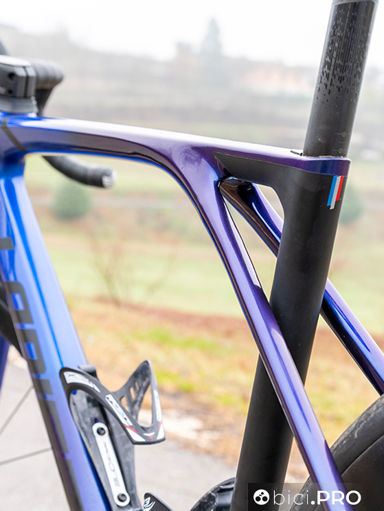 Nonostante un facile accostamento, possibile per quello che concerne l’impatto estetico e la categoria del mezzo, la forma di tutte le tubazione è totalmente differente. Solamente il piantone è simile, perché è rotondo e utilizza la svasatura bassa nei pressi del passaggio della ruota. E’ stato mantenuto, anzi migliorato il concetto GLP, ovvero il posizionamento della batteria Di2 tra obliquo e scatola del movimento centrale, con l’obiettivo di portare le masse verso il basso, aumentando la stabilità.