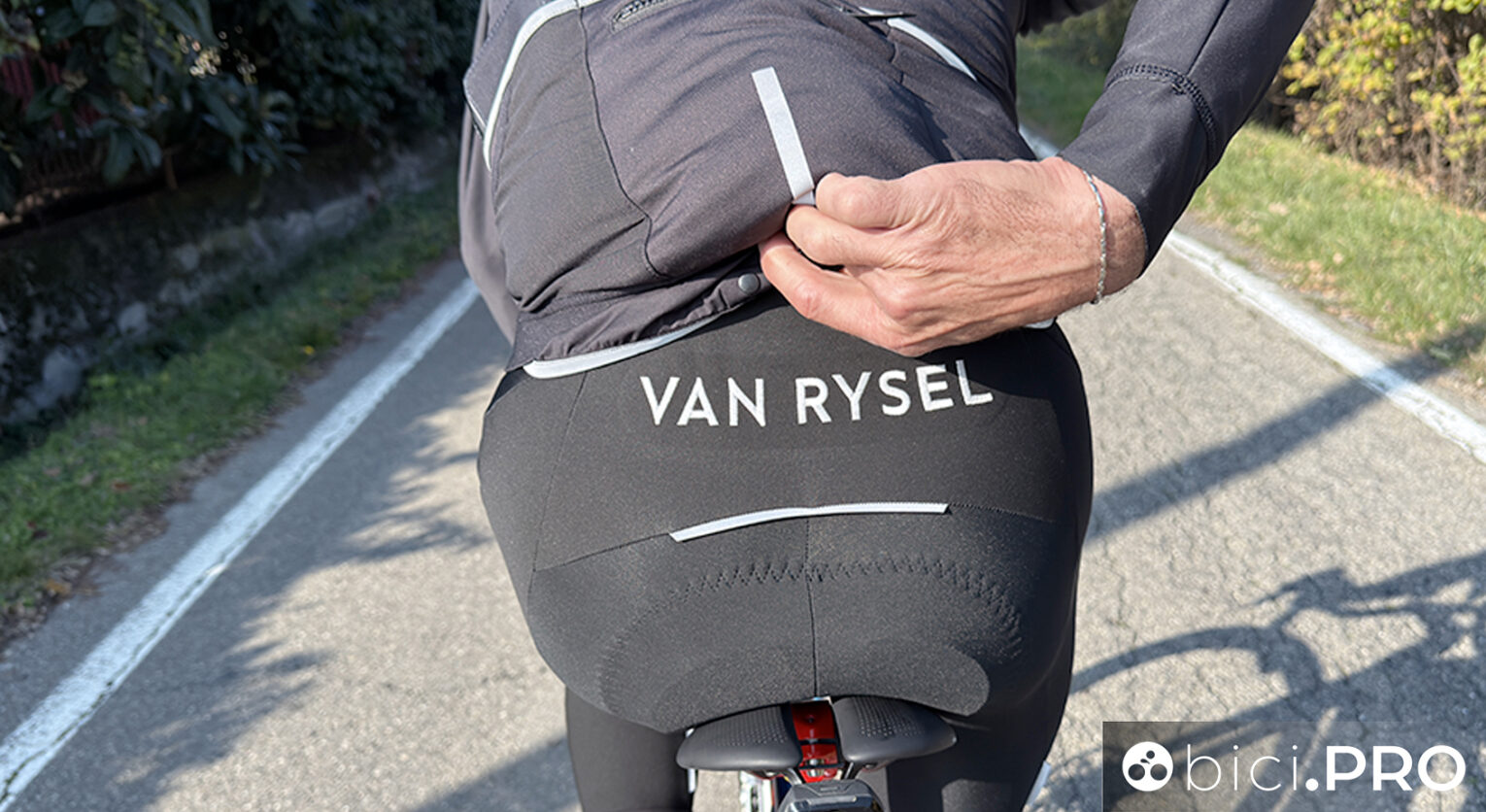 Il tessuto posizionato su fianchi e glutei, cosce e sulle gambe, fino alle caviglie alterna spessori e densità differenziate. Sulle articolazioni c’è una maggiore elasticità, mentre sulle sezioni meno soggette a rotazione movimento il tessuto caldo è completato da una membrana che protegge dal freddo (mai goffa e troppo rigida). Sulle caviglie il tessuto è molto sottile e privo di imbottiture, per evitare accumuli di umidità. Anche il giro vita ha spessori differenziati, caldo dove serve e più leggerezza dove è fondamentale garantire quest’ultima. Le bretelle sono molto elastiche e forate. Il fondello è prodotto da Elastic Interface su specifiche Van Rysel (sempre una garanzia). E’ molto scarico al centro e nella sezione anteriore che funge come una “tasca”, pieno e sostanzioso ai lati (e punti principali di contatto). A nostro parere è un fondello che trova la giusta interfaccia con le selle moderne che presentano il foro/canale di scarico centrale.