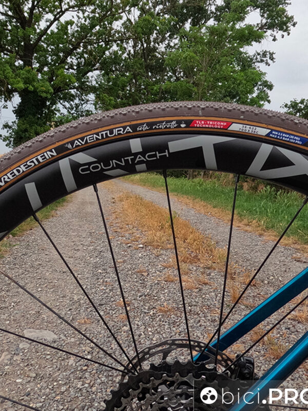 Le abbiamo provate con un set di ruote Ursus Countach, cerchio hookless con canale interno da 23 millimetri di larghezza (32 millimetri complessivi). Rigide e dalle risposte decise, ruote che non fanno altro che aumentare le caratteristiche di uno pneumatico del genere, a nostro parere tanto scorrevole, quanto corsaiolo. La larghezza del canale interno e quella complessiva del cerchio sono l’interfaccia perfetta per un tubeless con queste dimensioni e con uno shape del genere.