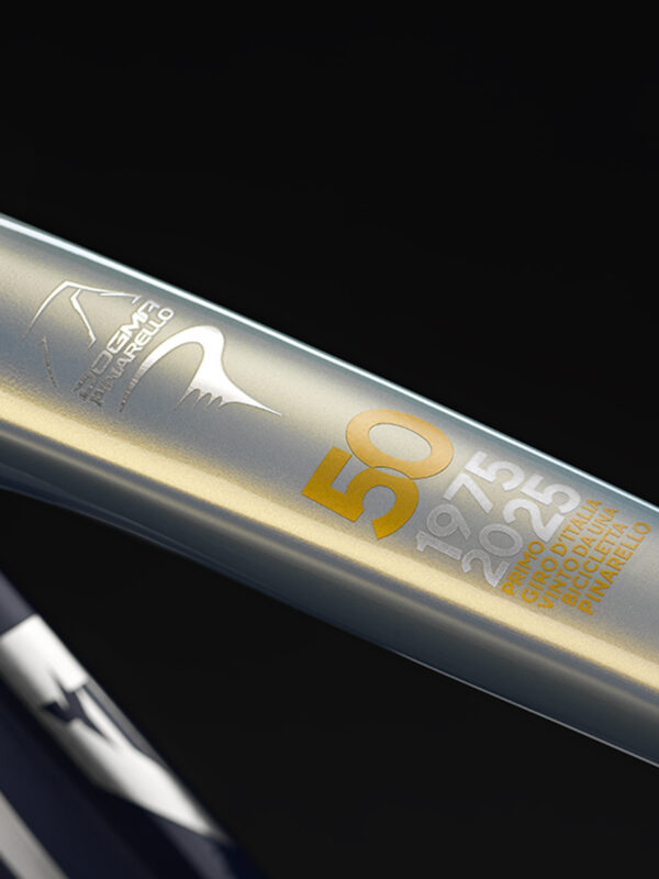 Tecnicamente si tratta dell’ultima versione della bici top di gamma Pinarello, la medesima utilizzata dai campioni del Team Ineos-Grenadiers, ma per onorare la leggenda la maison trevigiana ha messo a punto una livrea cromatica dedicata.