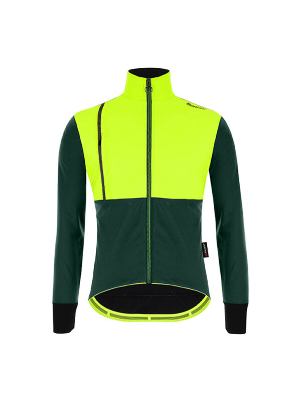Per la sicurezza di chi pedala la giacca è cucita con tessuti dai colori accesi sul petto, sul collo e sulla schiena, all’altezza delle tasche. Inoltre il logo Santini, posizionato sulla parte sinistra della schiena e sulla spalla destra, è rifrangente.