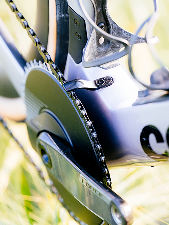 Trovare una bici che porta in dote dei concetti aerodinamici avanzati anche in ambito gravel non ci sorprende, soprattutto se contestualizziamo le bici Cervélo. Restando in ambito gravel, le velocità di punta e medie hanno avuto un incremento esponenziale e sotto il profilo tecnico la tendenza è di usare ruote ad alto profilo e pneumatici larghi. Qui il primo importante gamechanger del nuovo progetto, ovvero la possibilità di montare gomme da 45 millimetri di sezione, lasciando un ampio margine di sicurezza (6 millimetri) nei confronti delle tubazioni, considerando anche una corona da 52 denti.
