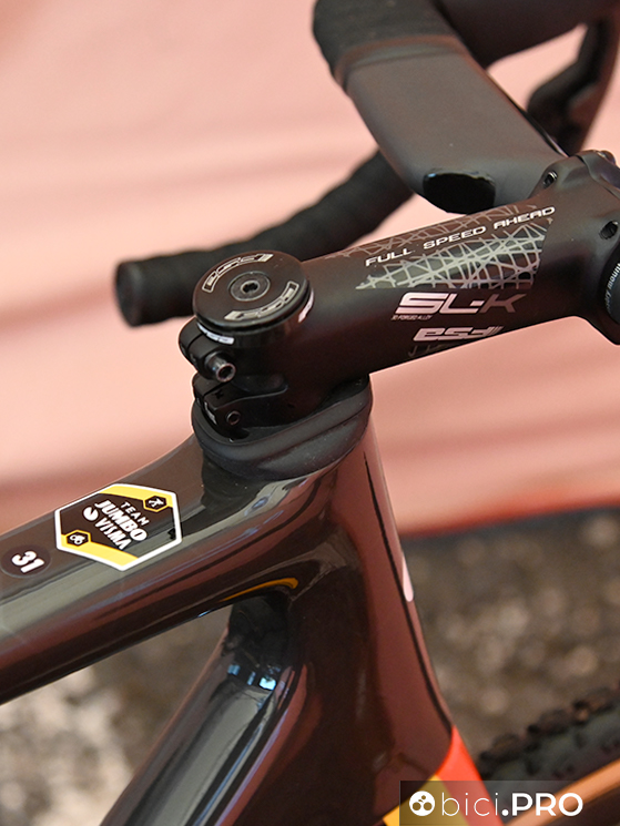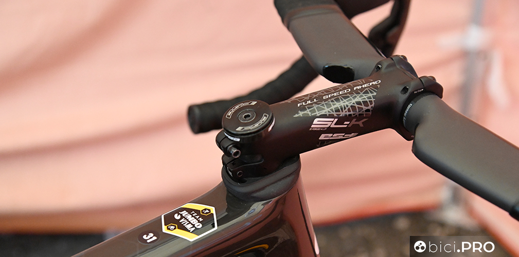 C’è la conferma anche del reparto guida con il cockpit firmato FSA-Vision. Van Aert utilizza un attacco FSA SL-K in alluminio (in battuta sul profilato dello sterzo) e la piega in carbonio Vision Metron Aero con un’angolazione aperta verso l’avantreno di 10 gradi. Questo manubrio è caratterizzato da un drop di soli 125 millimetri: valore che lo rende una sorta di compact, ma con una curvatura arrotondata che gli permette un’ampia sfruttabilità e facilità nel raggiungere le leve.
