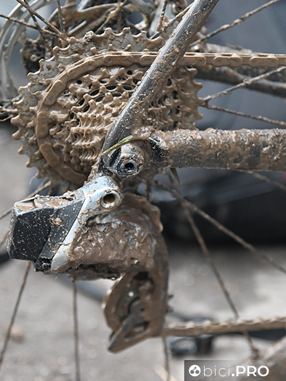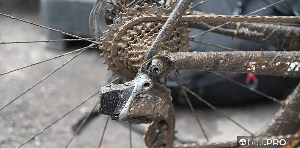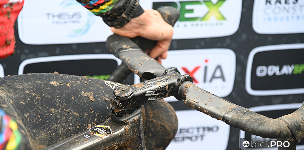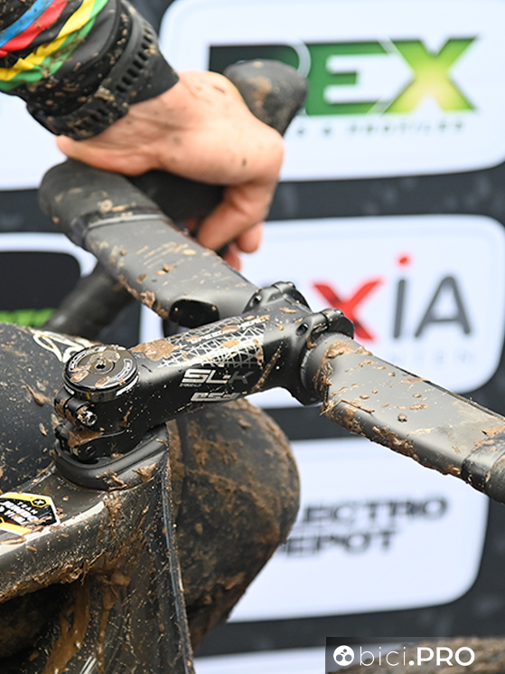 Nonostante il passaggio della Jumbo Visma da Shimano a Sram, i pedali usati da Van Aert nel cross sono gli Shimano XTR. Anche le calzature ed il casco si rifanno al portfolio Shimano, ovvero le S-Phyre XC9 ed il casco Lazer Vento KinetiCore con livrea RedBull.