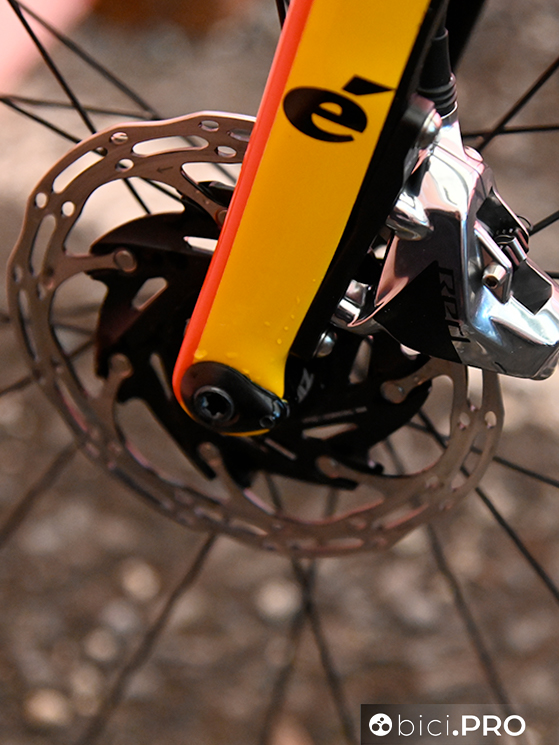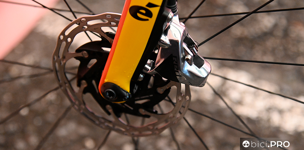 La dentatura del pacco pignoni varia tra la scala 10-28 Red e la 10-30 della ruota libera Force. La differenza tra le due è nel penultimo pignone: 24 per il Red, 27 per il Force, ma entrambi richiedono la medesima lunghezza della catena. Ci sono i dischi del freno da 140 millimetri di diametro, davanti e dietro.