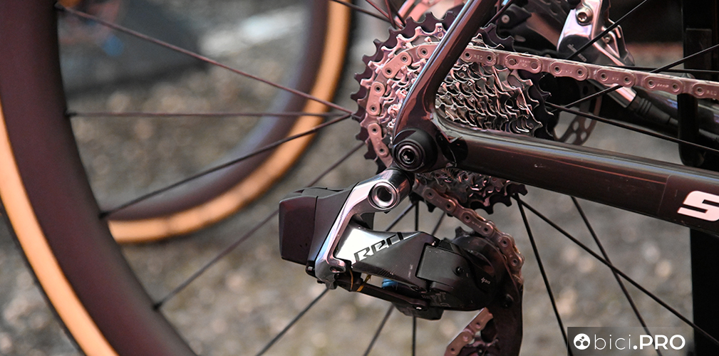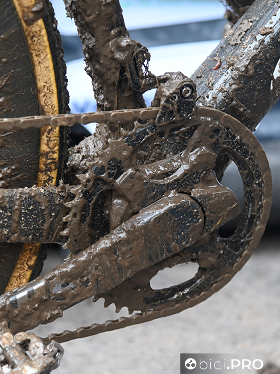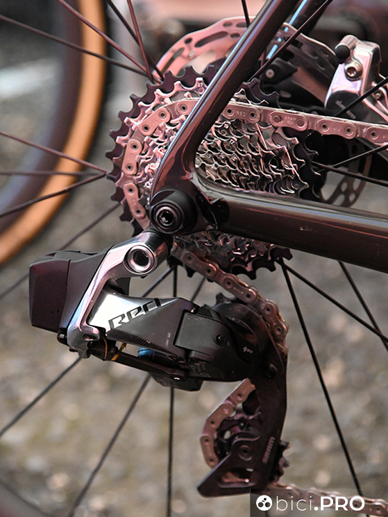 Per Van Aert è una sorta di ritorno al passato, quando in Crelan (all’epoca c’erano anche le bici Felt) ha utilizzato la trasmissione Sram con la corona singola anteriore. Oggi adotta la corona da 46 denti con il guidacatena, il power meter Quarq e i 12 rapporti posteriori (la trasmissione ha di base il gruppo Red eTap AXS).