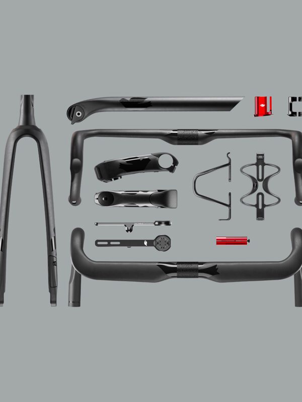 I componenti in carbonio Trittico (manubrio, attacco manubrio, reggisella, forcella e porta-borraccia) rappresentano l’avanguardia tecnologica e la qualità che hanno fatto grande l’azienda italiana e scritto pagine di storia del ciclismo.