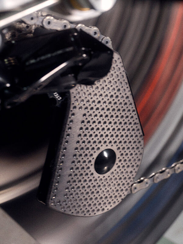 Al pari della cover full carbon (carbonio unidirezionale) ci sono le due pulegge oversize con dentatura differenziata. Sono 14 i denti per quella superiore, 19 per quella inferiore. Andiamo per ordine. Le coperture laterali sono completamente in carbonio e presentano dei piccoli incavi, studiati per aumentare l’efficienza. Le due pulegge sono in alluminio e lavorate con una precisione maniacale, il tutto prodotto in Francia.
