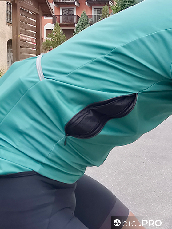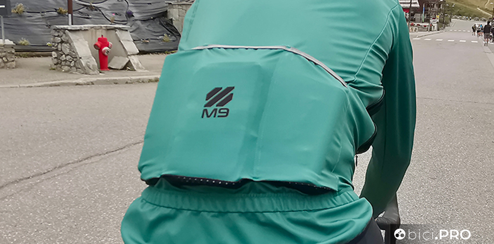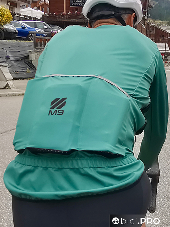 Non essendo comprimibile non è facile da inserire nelle tasche della maglia, perché occupa dello spazio. Nonostante questo il giubbino M9 Tempesta ha un peso ridotto, presenta due aperture laterali a scomparsa con delle zip. Una volta tirate giù le due cerniere, magari quando si pedala in salita, la ventilazione aumenta in modo importante, proteggendo al tempo stesso dalla pioggia leggera. La coda è particolarmente allungata verso il basso, protegge tutta la zona lombare e buona parte dei glutei.