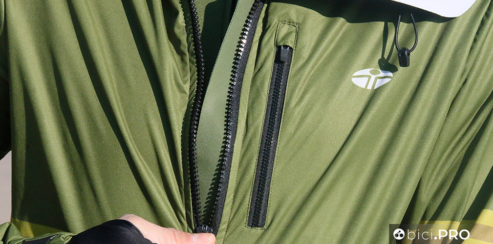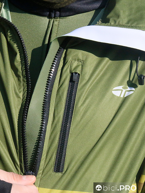 Ha una zip frontale lunga, sotto la quale è presente una pattina che ha il compito di aumentare la protezione dal vento. Ha tre tasche, anch’esse chiusa con le zip e sono due laterali basse e una superiore, dal lato sinistro. Il giro vita è customizzabile, grazie ad un inserto elastico che funge come una sorta di orlo.