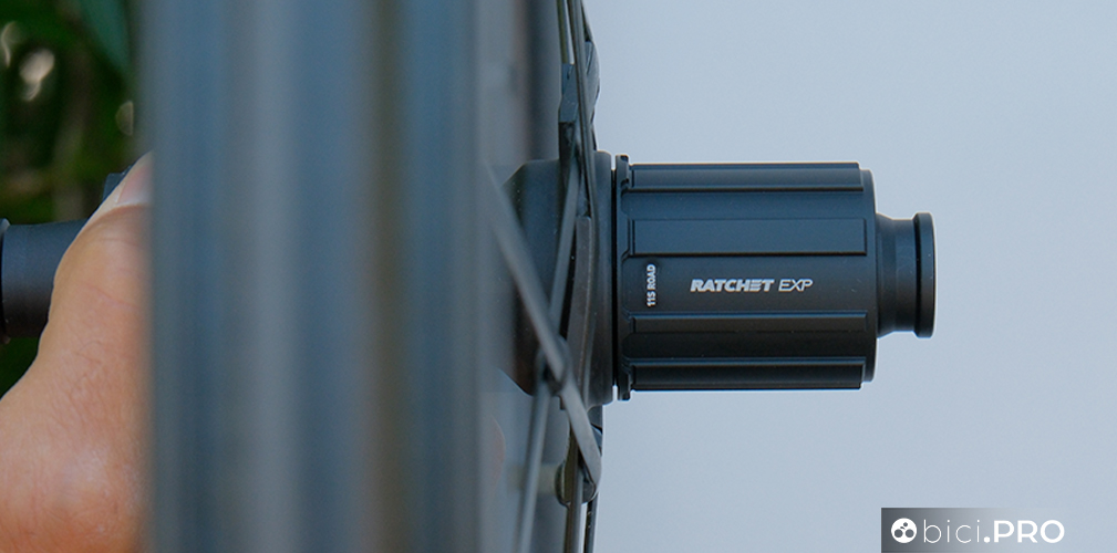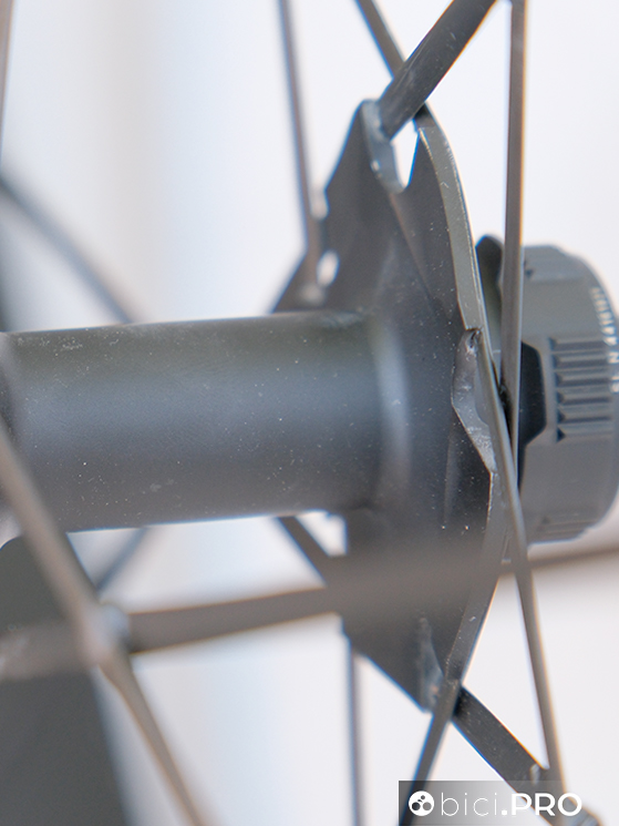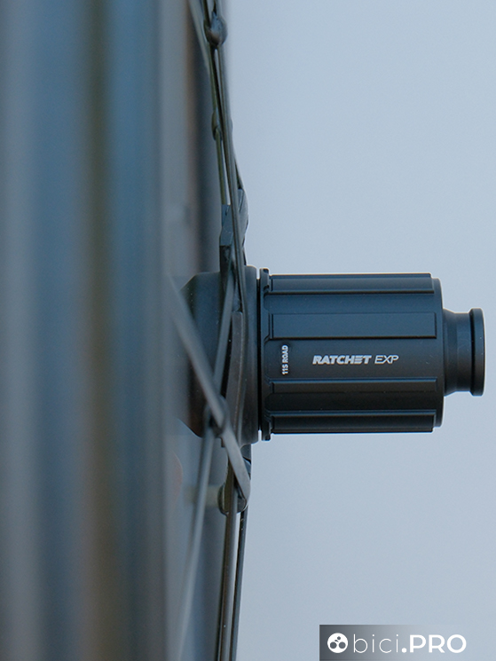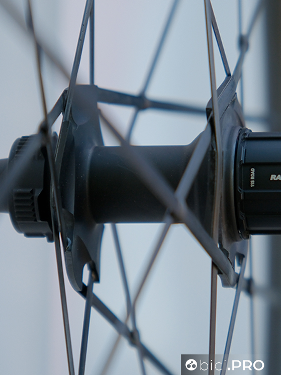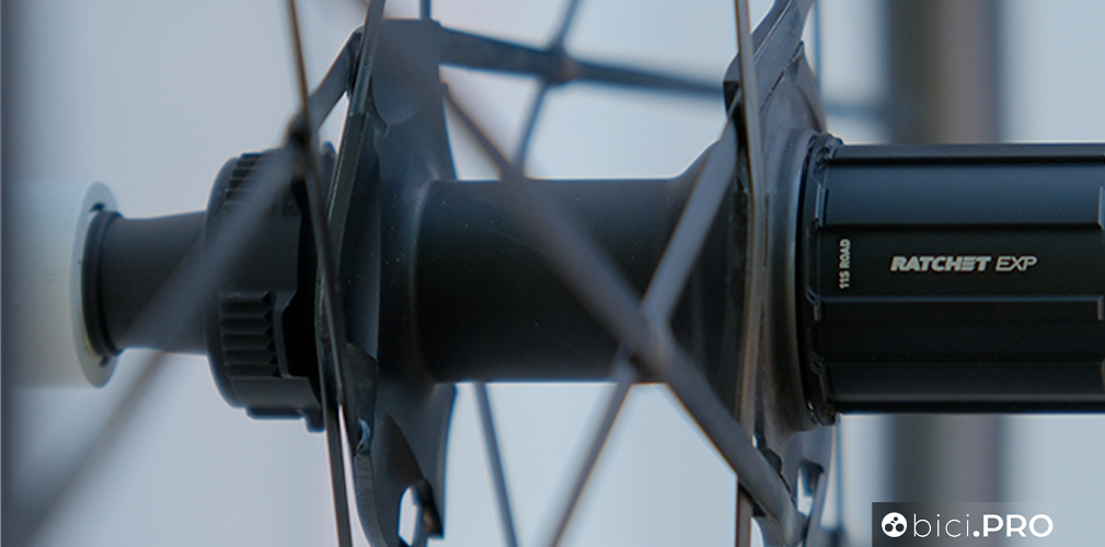I raggi sono rim-to-rim, sono incrociati in seconda e nel punto di incrocio adottano la storica “legatura” di rinforzo, eseguita con una pelle di carbonio. Ogni singolo raggio parte da un punto del cerchio, senza interruzioni ed arriva dal lato opposto, un blocco unico. Ogni singolo profilato si appoggia (ed è incollato) alle flange del mozzo in alluminio. I due mozzi, anteriore e posteriore non hanno dimensioni oversize (non hanno le flange in carbonio), sono dotati di una buona efficienza aerodinamica e contribuiscono a contenere il valore alla bilancia, molto basso. 1190 grammi dichiarati per le ruote in messa su strada. I mozzi hanno la meccanica interna che si basa sul Rachet System DT Swiss. Il prezzo di listino è di quelli importanti e si spinge oltre i 6000 euro.