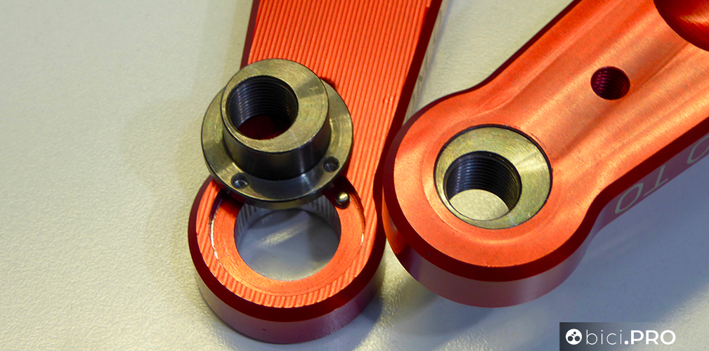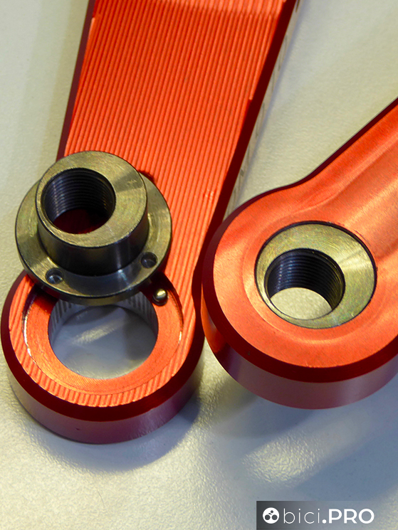 Anche l’asse centrale è costruito Magnetic Days. Il pacchetto ha un peso di poco superiore ai 2 chilogrammi e comprende inoltre un giro bulloni BCD 110 millimetri per le corone, con cinque dadi di fissaggio e una bussola filettata per i pedali. Quest’ultima è orientabile, con il vantaggio di fornire tre lunghezze: 170, 172,5 e 175 millimetri.