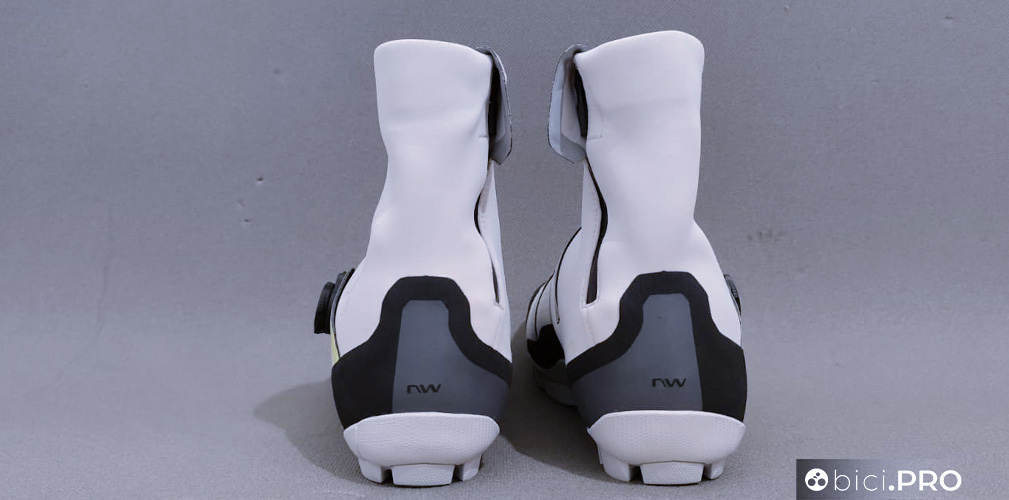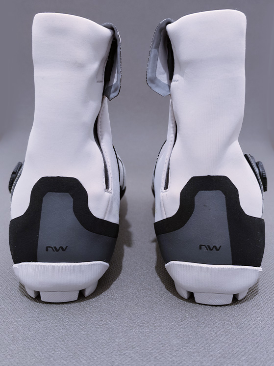 E qui, parlando di aspetto minimal, si apre un capitolo più “estetico” – anche se di estetica funzionale si tratta. Questa compattezza, priva di cuciture visibili, la rende molto isolante. In doppio strato si trovano solo la parte che copre la tomaia e quella dove è fissato il sistema di chiusura SLW2, un classico di Northwave con chiusura micrometrica azionata premendo la linguetta.