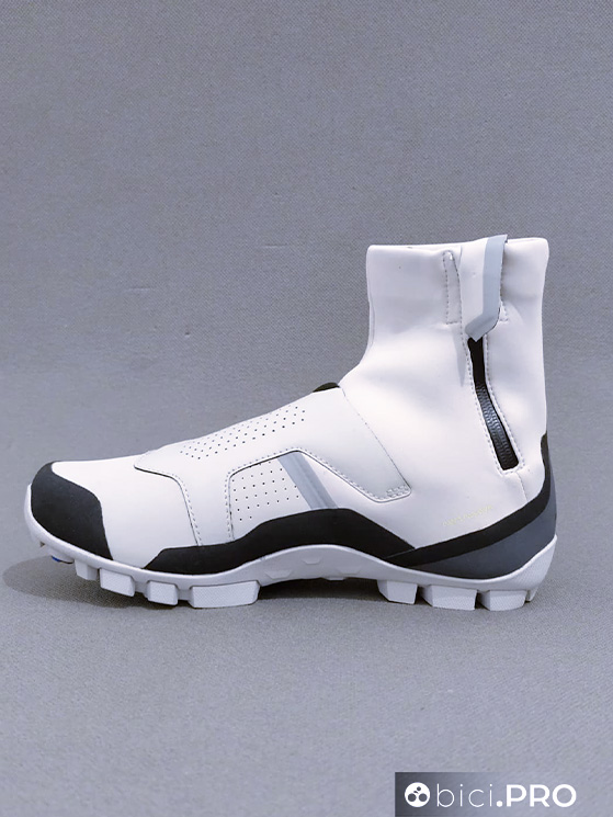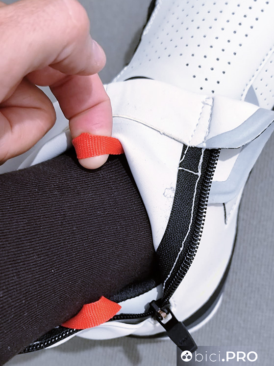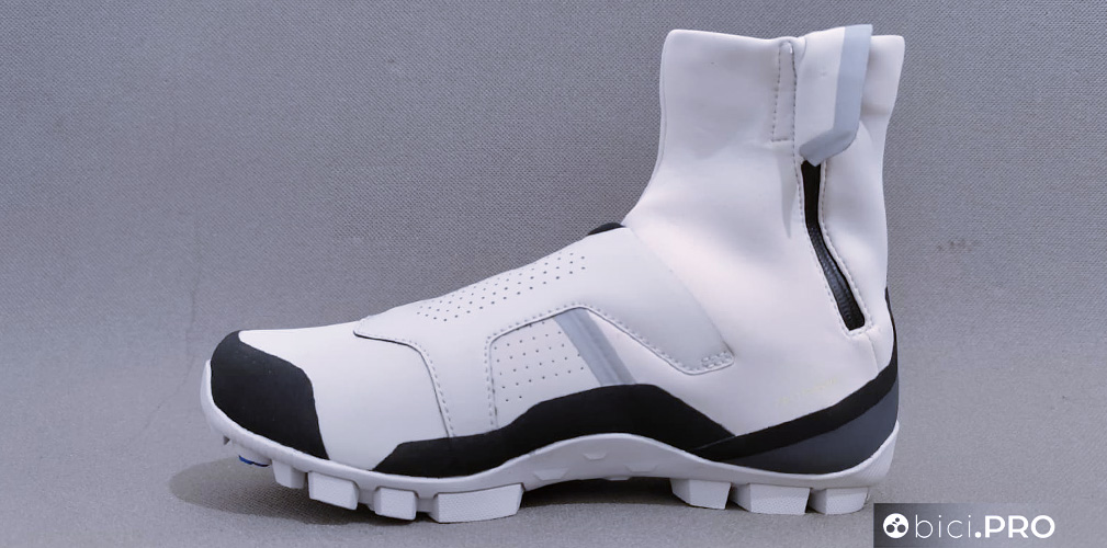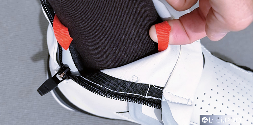 I rinforzi neri e grigi che si notano nella parte bassa e cingono la scarpa da punta a tallone, sul lato interno, contribuiscono all’isolamento idrico e termico. Sempre nella zona interna, la chiusura avviene tramite zip, coperta nella parte finale: un dettaglio importante, considerando lo sporco che può alzarsi dalle ruote durante l’uso.
