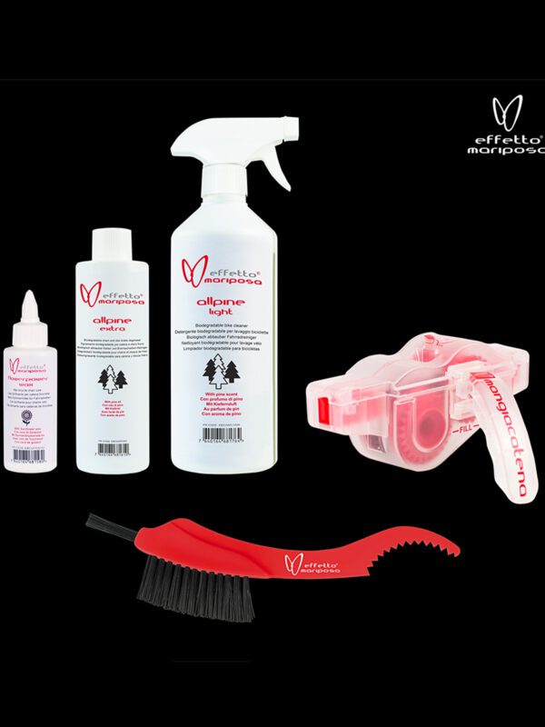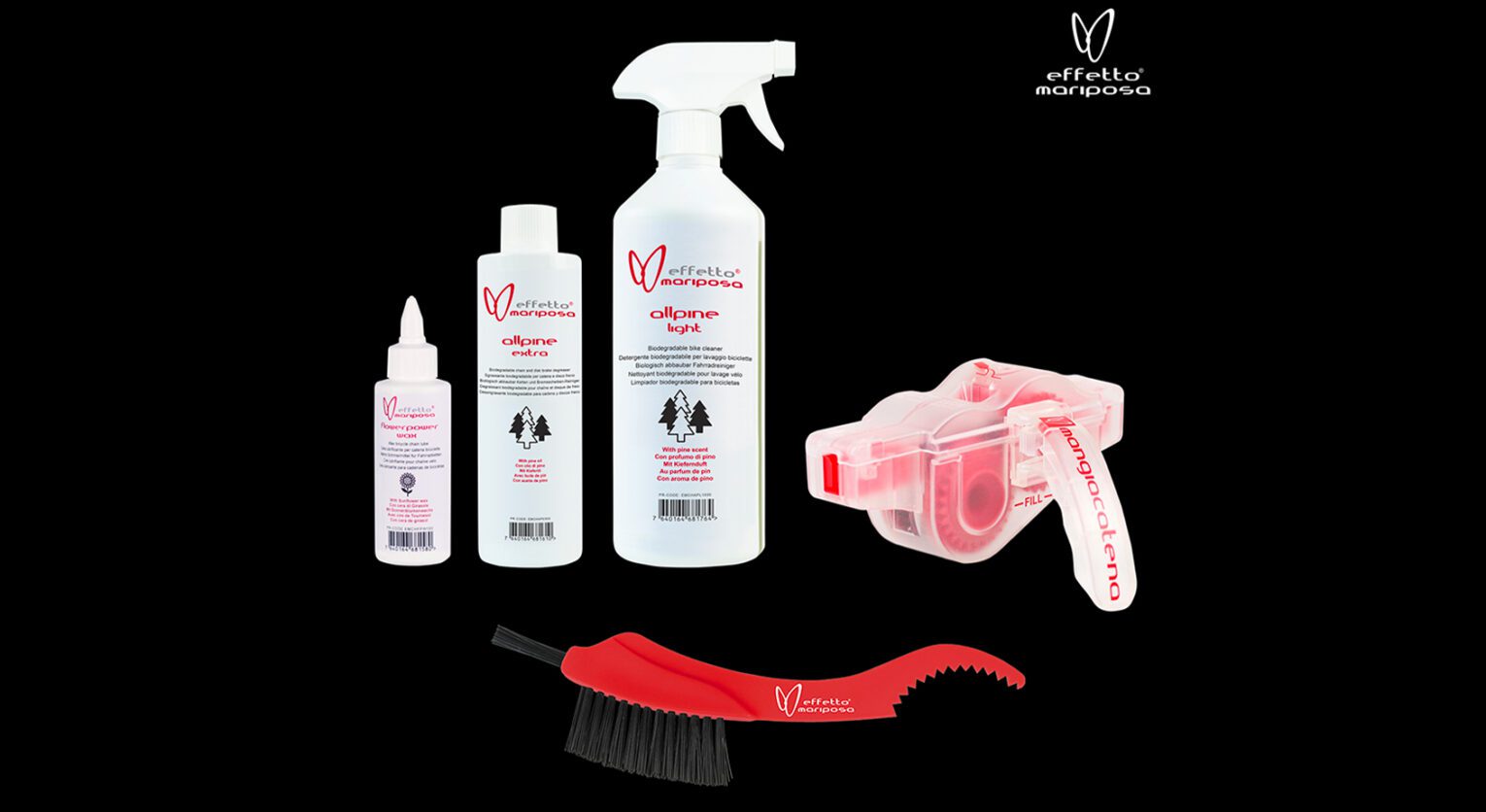 Con Alberto De Gioannini, presidente di Effetto Mariposa, capiamo la genesi e il ragionamento di fondo dei nuovi prodotti presentati oggi: Flowerpower Wax (lubrificante per catena con cera di girasole), Allpine Extra (sgrassante con olio di pino), Mangiacatena (dispositivo lavacatena), Cog Brush (spazzola per pignoni), Allpine Light (detergente biodegradabile per biciclette).