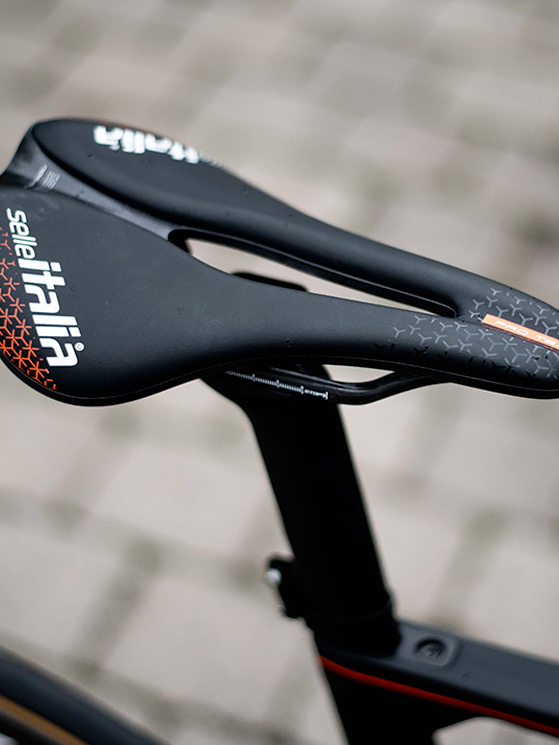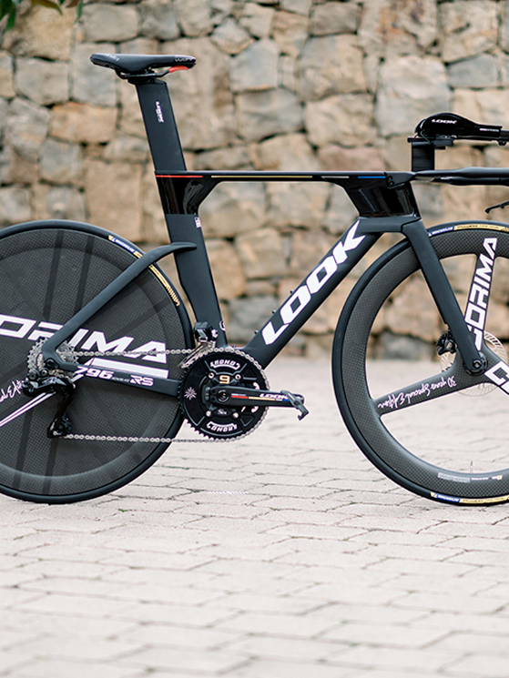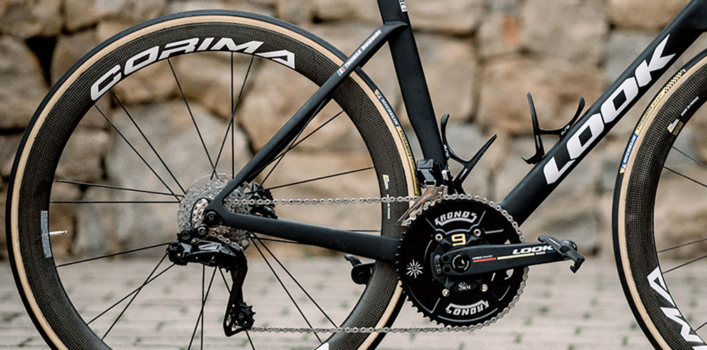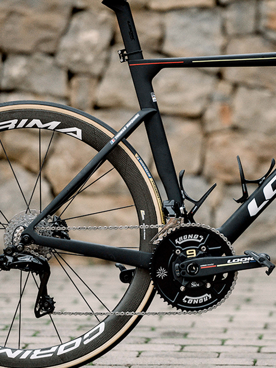 C’è la trasmissione Shimano Dura Ace a 12 rapporti, ma la guarnitura è la Look Carbon sviluppata in collaborazione con SRM (ovviamente integra questo power meter) e le corone sono Kronos. Le pedivelle hanno le bussole filettate che permettono di cambiare la lunghezza: 170 e 172,5, 175, tutte e tre in una sola pedivella. C’è Selle Italia.