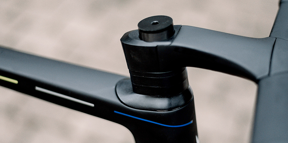 La tubazione orizzontale si sfina man mano che prosegue verso il retro. La geometria nel complesso non è marcatamente sloping. C’è un reggisella con una forma dedicata e il blocchetto di serraggio è contenuto tra l’orizzontale ed il piantone. Quest’ultimo ha il profilo posteriore tronco e rientra per lasciare una maggiore luce alla ruota.