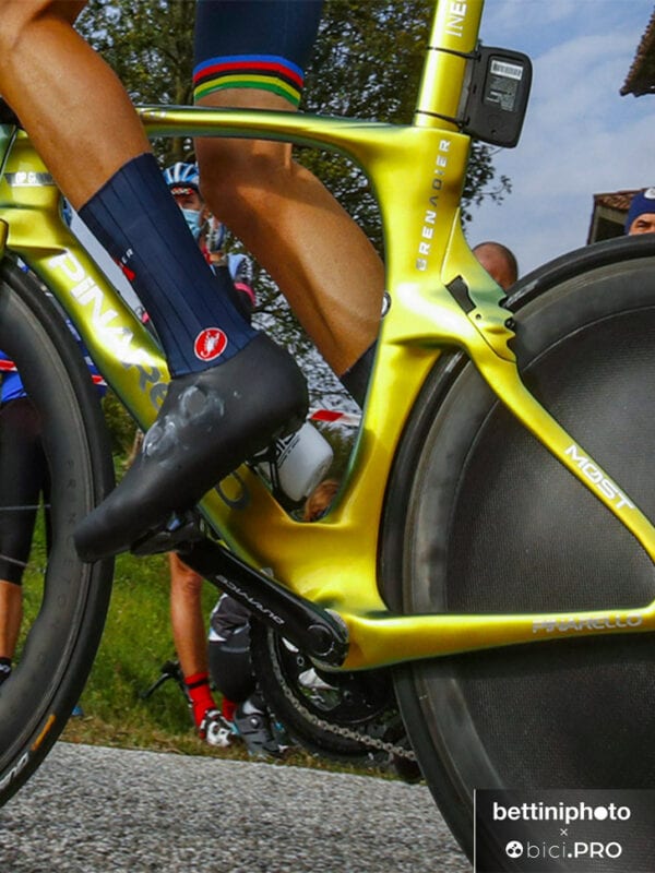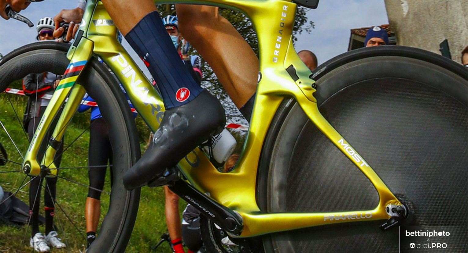 L’aspetto che risalta immediatamente agli occhi è il profilo particolare della ruota anteriore, la Wake 6560. Diciamo che nelle cronometro in questione si è potuta vedere soltanto l’anteriore, dato che al posteriore Ganna ha sempre utilizzato una lenticolare, ma in realtà si stratta di una vera e propria coppia che può essere utilizzata tranquillamente su tutti i tipi di biciclette da corsa e non solo.