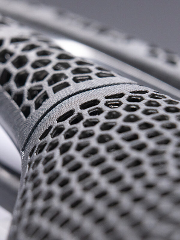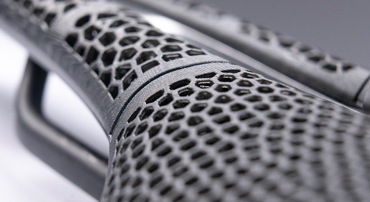 Per la produzione della copertura 3D è stata utilizzata la proiezione digitale della luce su ottiche permeabili all’ossigeno che proiettano su polimeri con una densità specifica. Il risultato è un materiale che ha una resa meccanica eccezionale, resistente ed elastico e che grazie al supporto differenziato asseconda la morfologia del ciclista in modo soggettivo. Le risposte meccaniche venno verso una sella “quasi” custom.