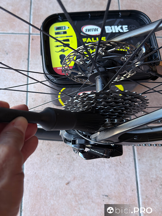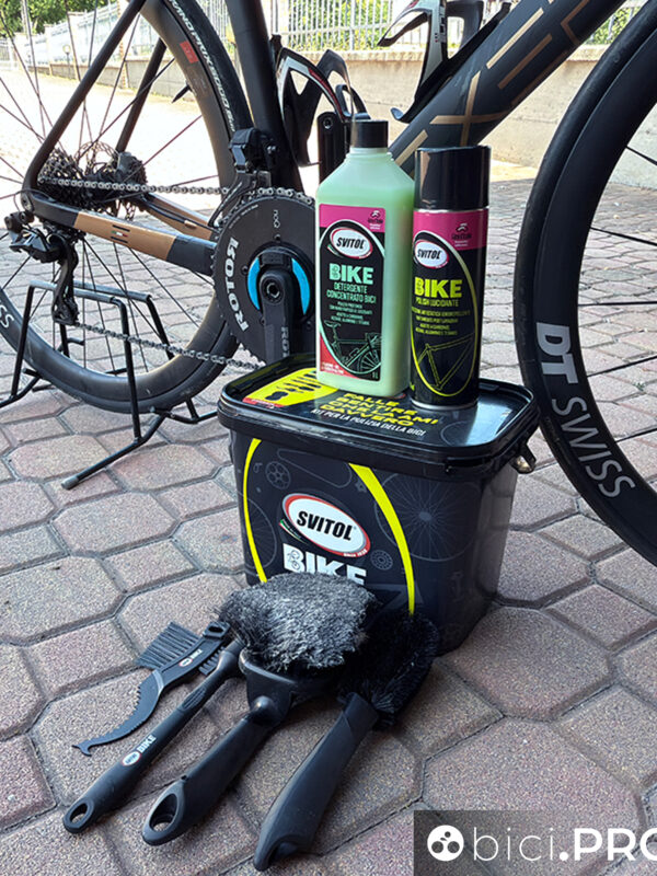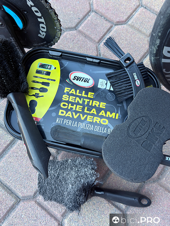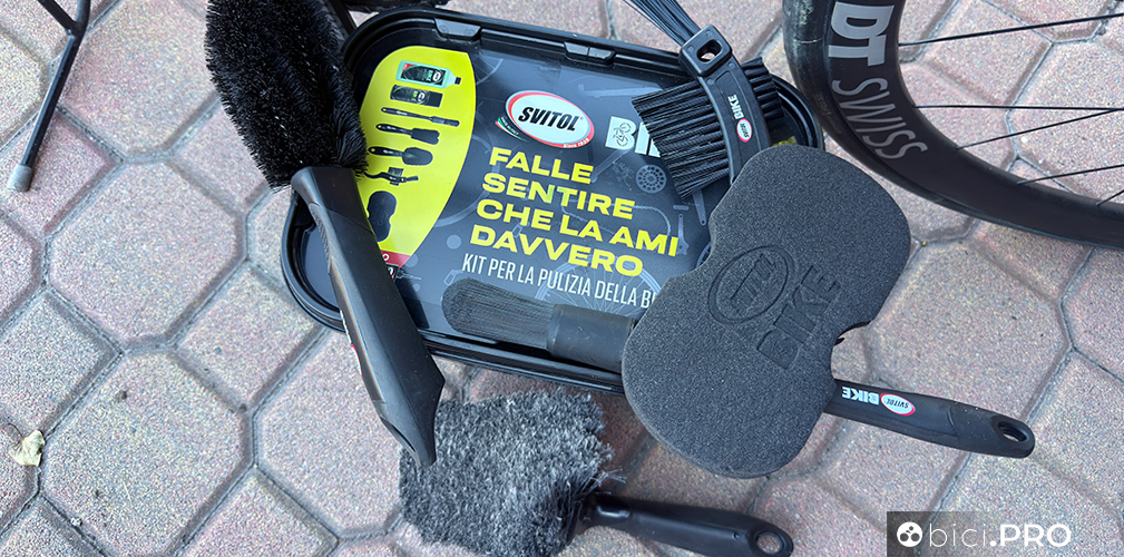 Per facilitare la pulizia della bicicletta, renderla veloce ed efficace, ci vogliono anche gli strumenti giusti. Il kit Svitol include (5 accessori) una spugna morbida e delicata, oltre ad una serie di spazzole con setole e forme differenti. L’obiettivo è offrire lo strumento giusto per ogni singola parte della bici (telaio, raggi e cerchi, ingranaggi e catena).