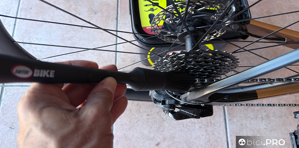 Nel box Svitol ci sono la spugna, ma soprattutto quattro spazzole con setole diverse, per spessore, lunghezza e densità, per impieghi differenti. Quella più grande è dedicata al telaio in genere, con setole morbide e per nulla aggressive, è una sorta di coadiuvante all’azione della spugna. La spazzola con la testa che si separa in due parti è indicata per i cerchi, per i raggi, a nostro parere anche per la catena e le corone. La 4 in 1 è specifica per gli ingranaggi posteriori, pignoni e pulegge, dove lo sporco ed i residui si annidano bloccando la trasmissione. E’ particolarmente utile alla pulizia tra pignone e pignone. C’è quella che assomiglia ad un pennello, anche questa specifica per i pignoni, utile a nostro parere anche per “tirare” in modo corretto la nuova lubrificazione (fatta dopo la pulizia). E’ importantissimo usare le spazzole sempre costantemente per lo stesso scopo.