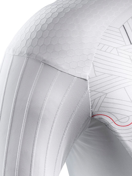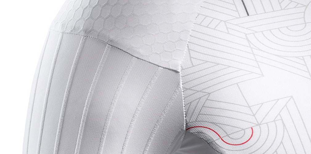 Davanti c’è una trama fitta e una zip lunga facilmente accessibile, il tutto per garantire comfort e stabilità del capo. Il collo è ribassato e le spalle sono coperte da un tessuto con trama irregolare e “cellette”. Questa parte deve assecondare il piegamento verso il basso e porre la minima resistenza all’aria. E’ una delle parti del corpo più esposte allo spazio. Infine la pannellatura posteriore con le tre tasche. C’è una rete mesh ultra fine e leggera che non ostacola la veicolazione all’esterno dell’umidità prodotta durante lo sforzo. Non sfarfalla grazie alla sua elasticità. Il prezzo di listino è di 175 euro.