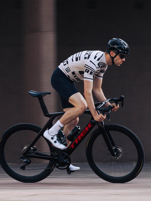Tornando alla collezione di Santini, secondo la Treccani “capsule collection” significa: “Collezione essenziale di capi d’abbigliamento, composta da pochi elementi facilmente abbinabili e intercambiabili tra di loro.” Si tratta quindi di una linea di abbigliamento e accessori dal design coordinato, che comprende due jersey, un pantaloncino in variante nera e bianca, una maglia intima, uno smanicato e una giacca antivento. A ciò si aggiungono gli accessori abbinati: calzini, cappellino e borraccia. Andiamo a vedere la collezione più nel dettaglio.